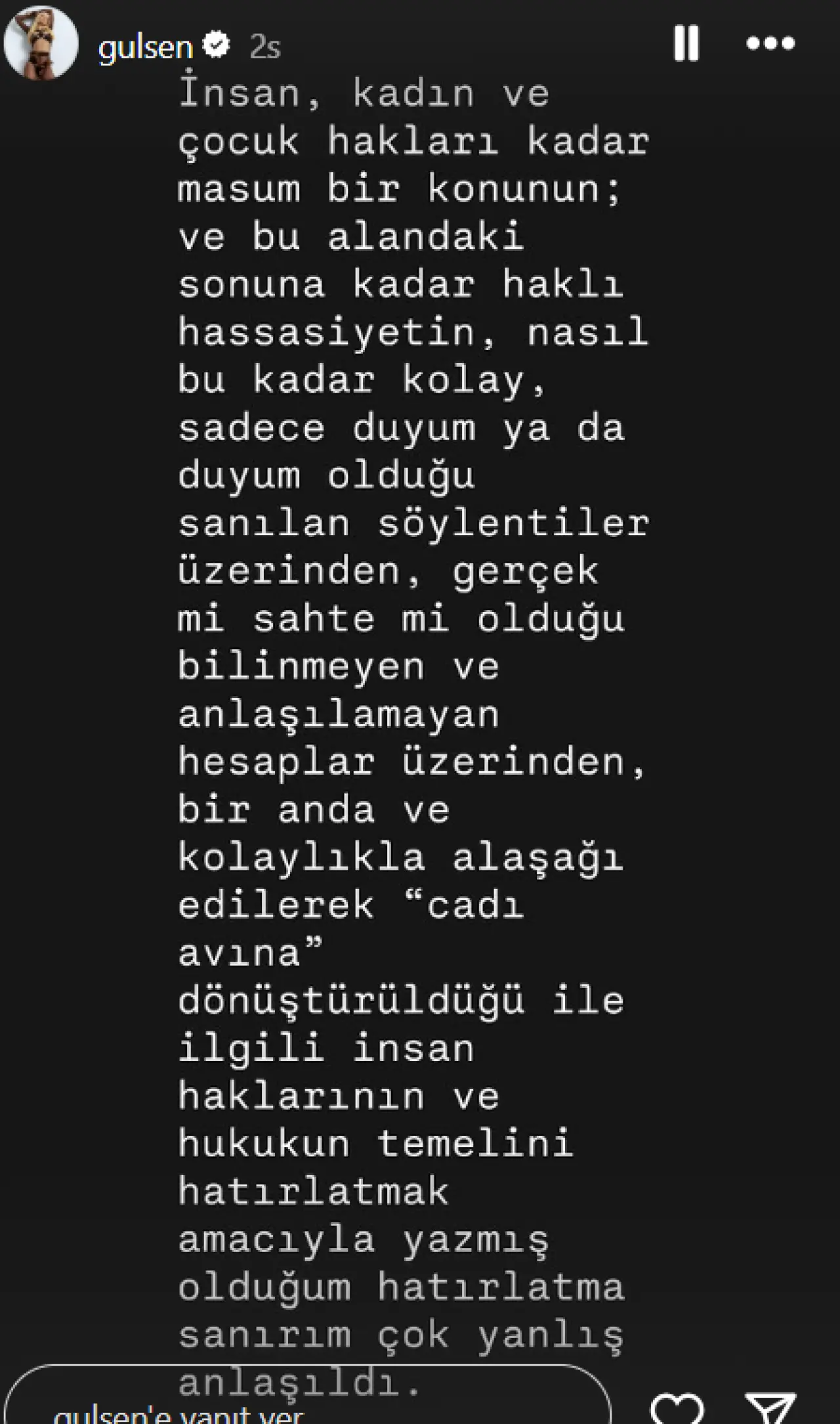 Tepkilerin ardından Gülşen, açıklamasına devam ederek, söylediklerinin yanlış anlaşıldığını ve “Kadın ve çocuk hakları kadar masum bir konunun, sadece duyum ve söylentiler üzerinden bu kadar kolay şekilde alaşağı edilmesinin doğru olmadığını” belirtti.