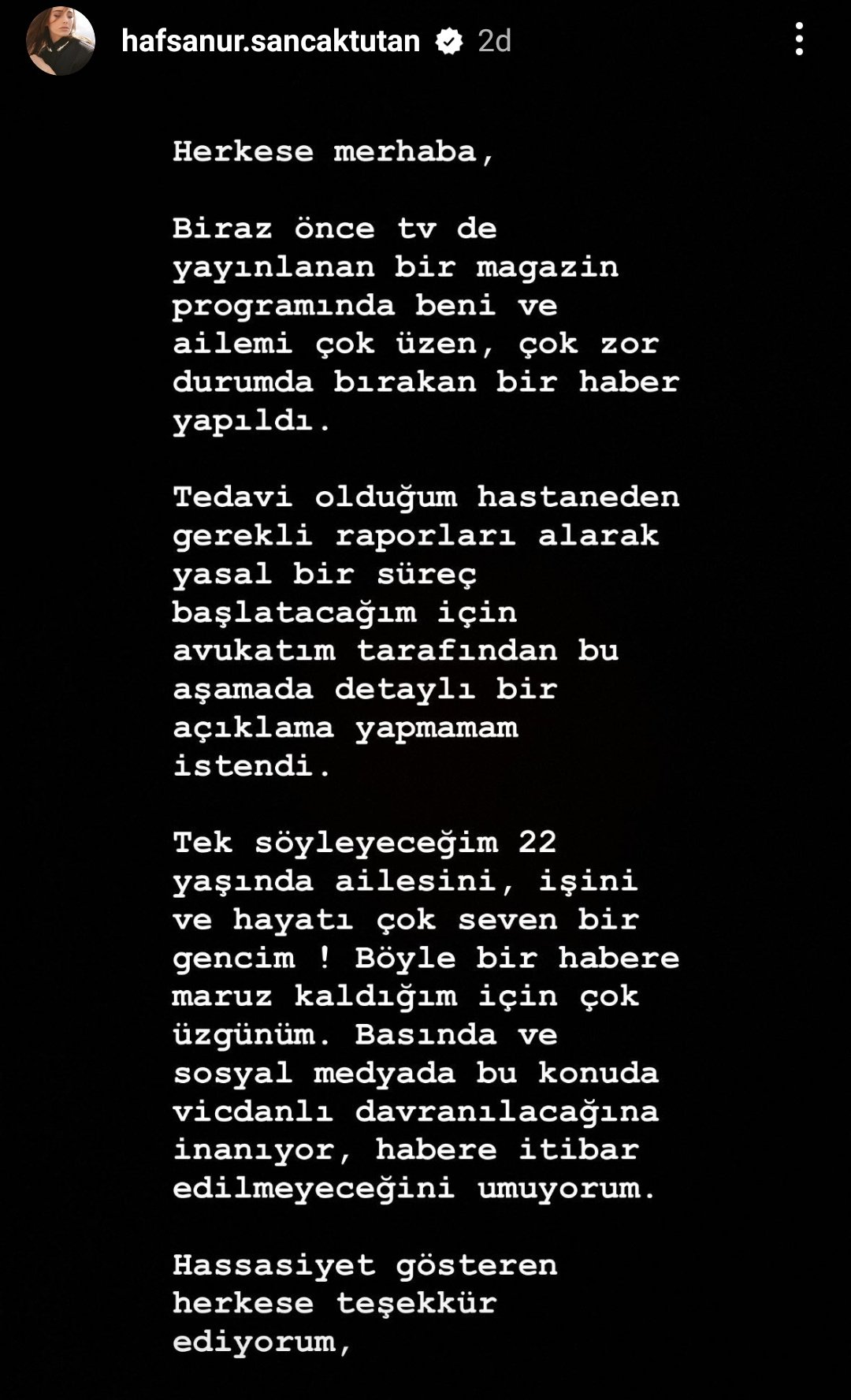 Konu hakkında Instagram hesabından açıklamada bulunan ve iddialara yanıt veren Hafsanur Sancaktuan şu mesajı paylaştı;