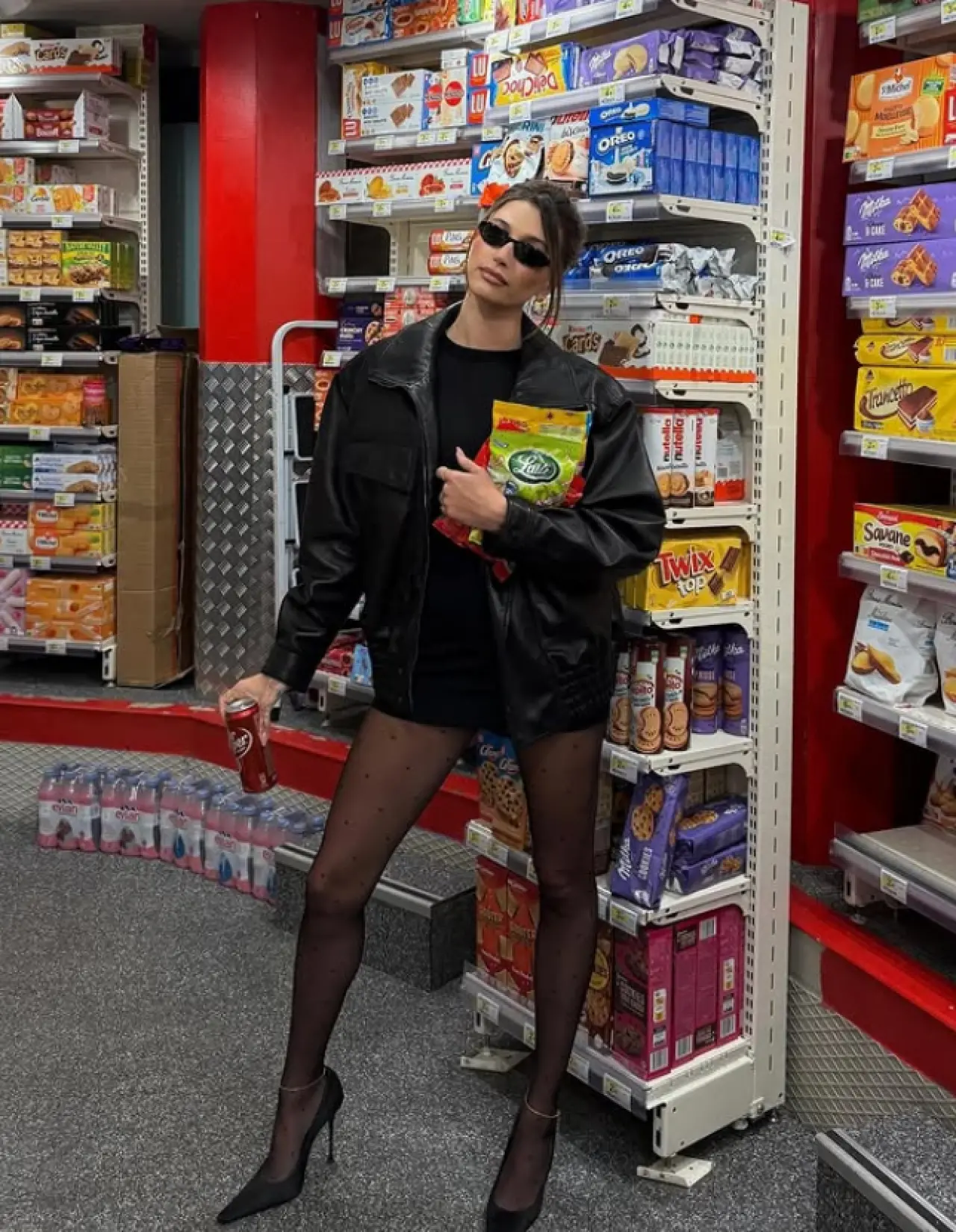Hailey Bieber, moda anlayışını her zamanki gibi sıra dışı bir yerde konuşturdu: Bir süpermarket. Elinde patates cipsi ve buzlu kahveyle poz verdiği karede, siyah mini elbisesi, oversize deri ceketi ve file çoraplarıyla tam anlamıyla “stil ikonu” mesajı verdi. Gözlükleri ve topuklu ayakkabılarıyla bu rahat ama iddialı görünüm, hayranlarından büyük beğeni aldı.