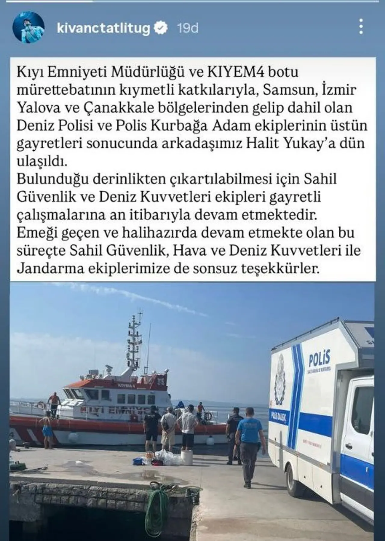 "Kıyı Emniyeti Müdürlüğü ve KIYEM4 botu mürettebatının kıymetli katkılarıyla, Samsun, İzmir, Yalova ve Çanakkale’den gelen Deniz Polisi ve Polis Kurbağa Adam ekiplerinin üstün gayretleri sonucunda arkadaşımız Halit Yukay’a ulaşıldı. Emeği geçen tüm ekiplerimize teşekkür ederiz."