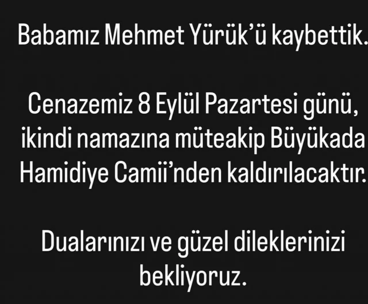 Ünlü isim, Instagram hesabından yaptığı paylaşımla herkesi duygulandırdı. “Babamız Mehmet Yürük’ü kaybettik. Cenazemiz 8 Eylül Pazartesi günü, ikindi namazına müteakip Büyükada Hamidiye Camii’nden kaldırılacaktır. Dualarınızı ve güzel dileklerinizi bekliyoruz” ifadelerini kullanan Yürük, takipçilerini hüzne boğdu.