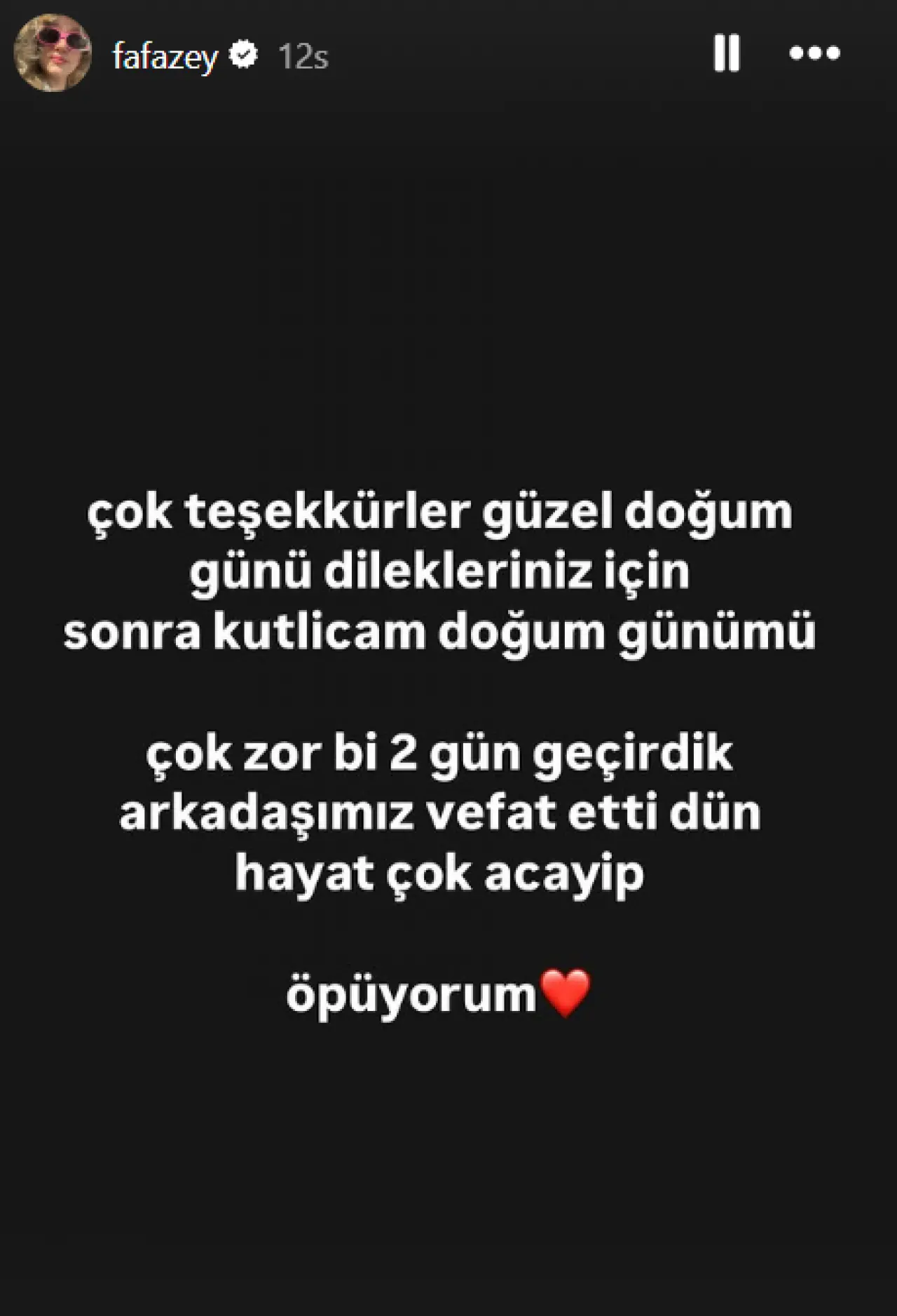 “Sonra kutlayacağım” diyerek söze başlayan ünlü oyuncu, yakın bir arkadaşını kaybettiğini duyurdu. “Çok zor bir iki gün geçirdik. Dün bir arkadaşımızı kaybettik, hayat çok acayip” ifadeleriyle yaşadığı derin üzüntüyü dile getiren Abdullah, 36. yaşını buruk bir şekilde geçirdi.