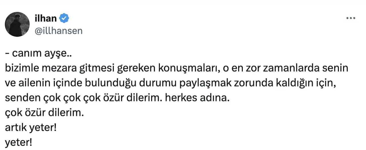 Şen, depremzede Ayşe’nin paylaşımına yanıt olarak yaptığı uzun açıklamada şu ifadeleri kullandı: "Canım Ayşe... Bizimle mezara gitmesi gereken konuşmaları, o en zor zamanlarda senin ve ailenin içinde bulunduğu durumu paylaşmak zorunda kaldığın için, senden çok çok çok özür dilerim. Herkes adına. Artık yeter! Yeter!"