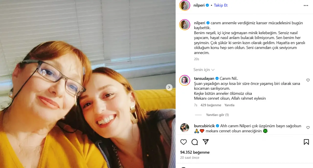 Ünlü oyuncu Nilperi Şahinkaya, hayatının en büyük acısını yaşıyor. Annesi Meltem Vural, uzun süredir devam eden kanser mücadelesini kaybederek hayata veda etti.