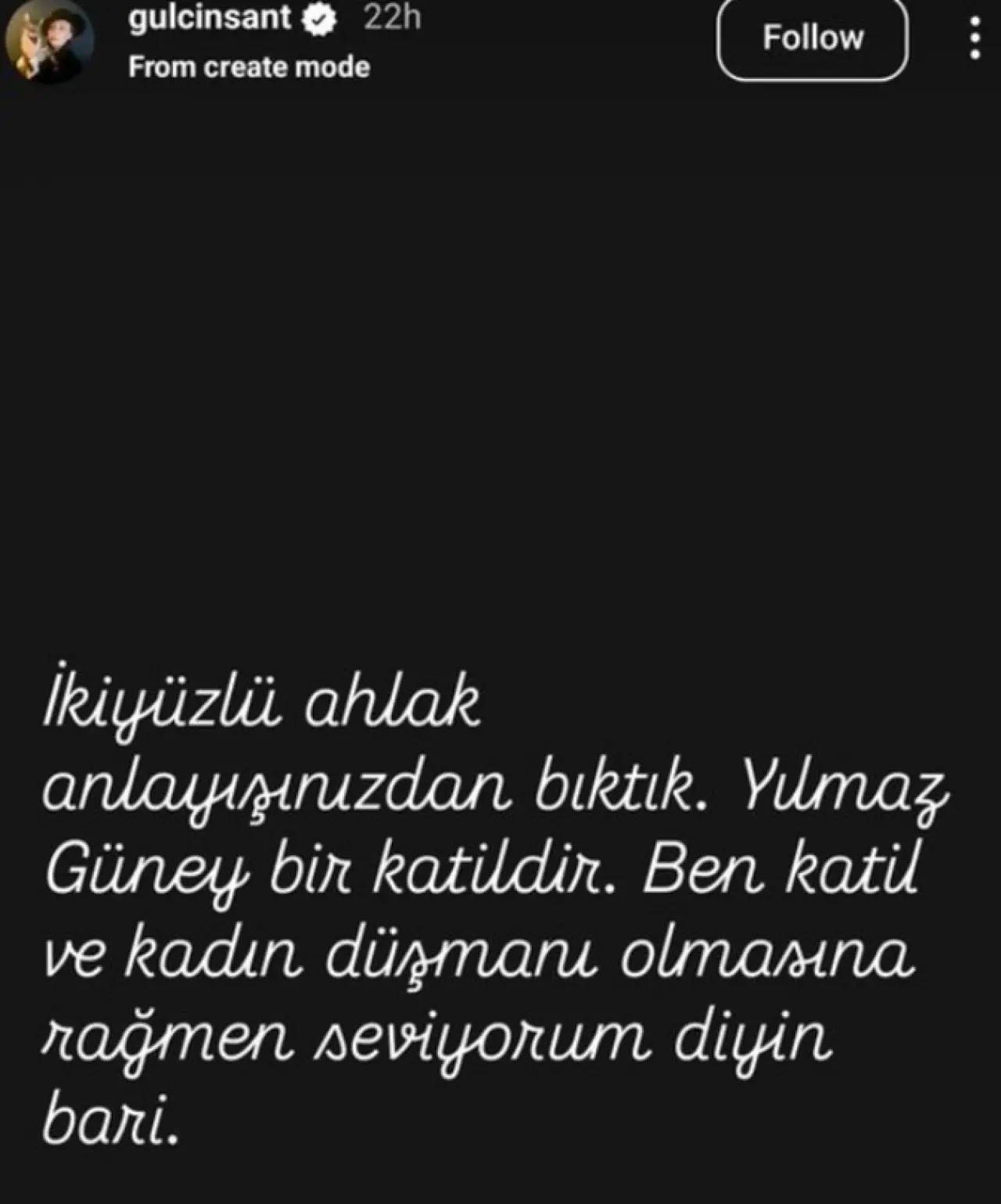 "İkiyüzlü ahlak anlayışınızdan bıktık. Yılmaz Güney bir katildir. Ben katil ve kadın düşmanı olmasına rağmen seviyorum deyin bari."