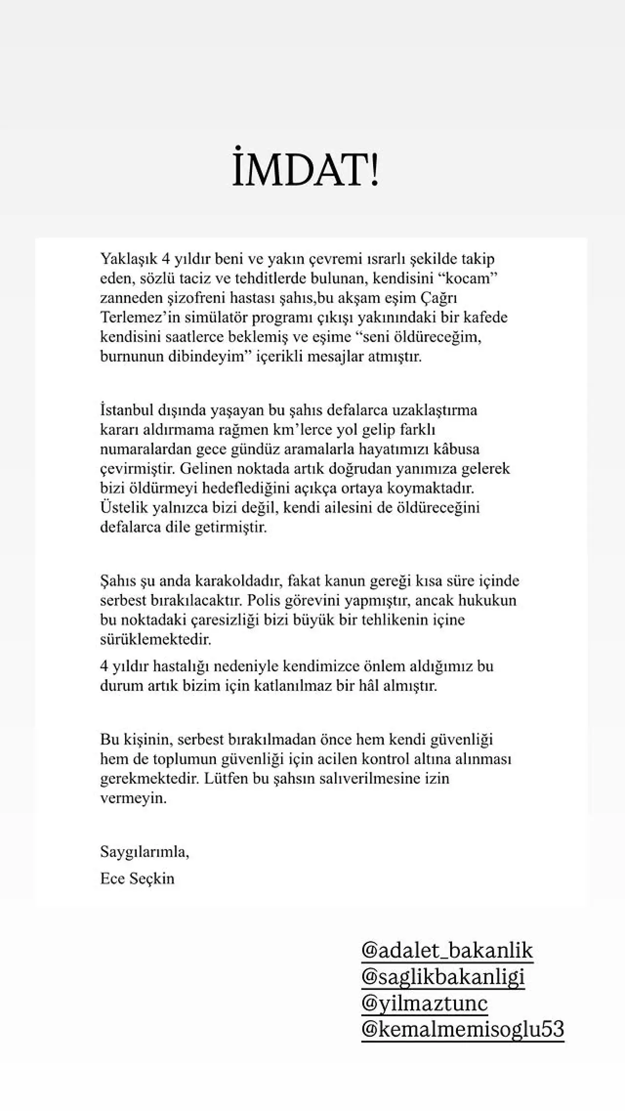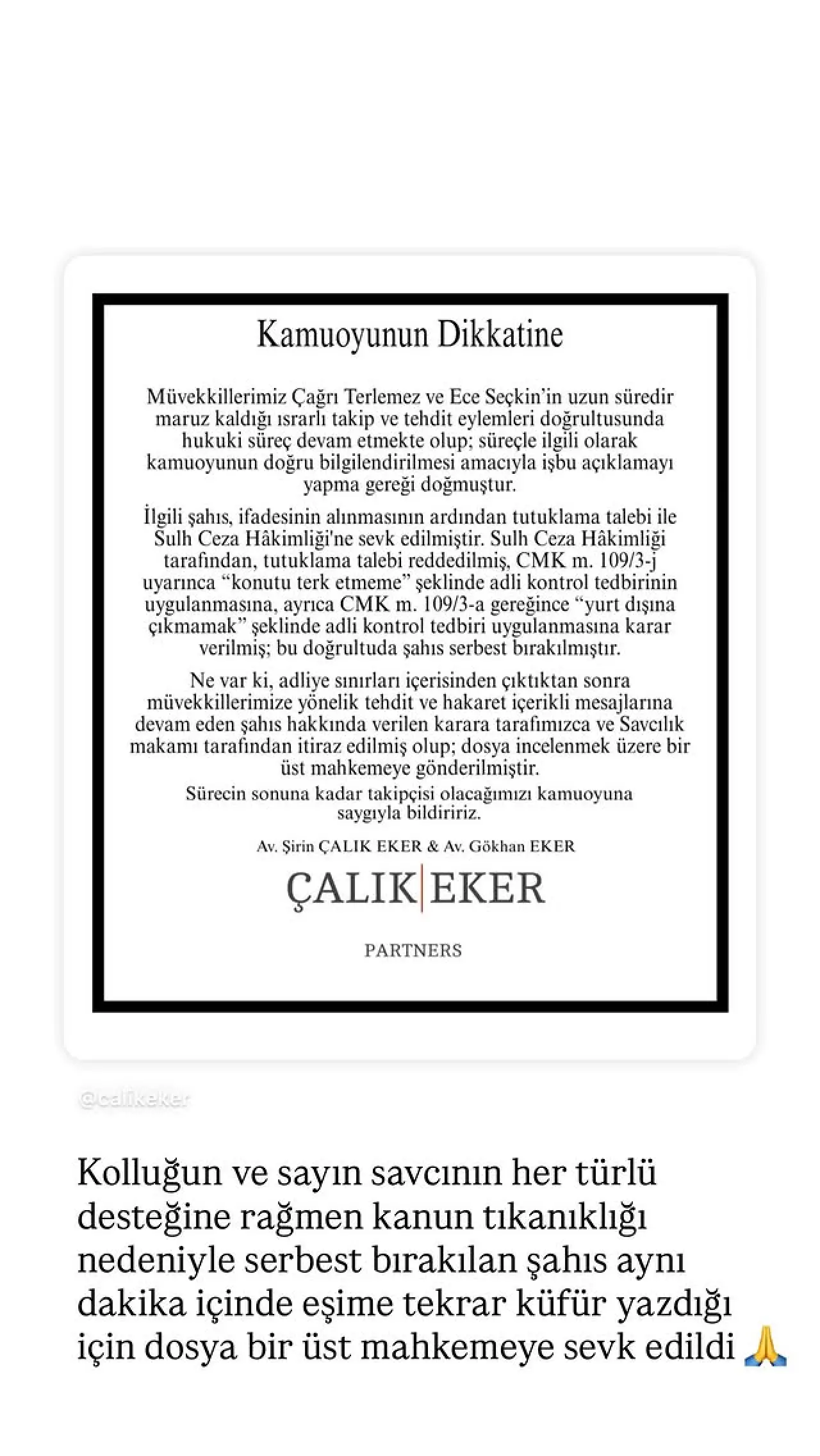 “Müvekkillerimiz Ece Seçkin ve Çağrı Terlemez’e yönelik ısrarlı takip, tehdit ve hakaretler dört yıldır sistematik şekilde sürmektedir. Şüpheli, adliyeden çıkar çıkmaz tehdit ve hakaret içeren mesajlarına devam etmiş, adli kontrol tedbirine rağmen tehlike yaratmayı sürdürmüştür.”