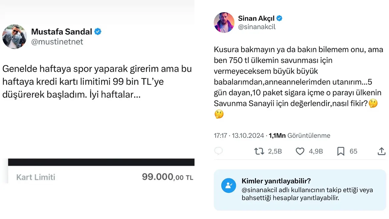 Sinan Akçıl sözlerinin devamında ise paylaşımında kredi kartı limitinde uygulanacak katkı payı için şu ifadelere yer verdi: "5 gün dayan 10 paket sigara içme. O parayı ülkenin Savunma Sanayisi için değerlendir, nasıl fikir?" diyerek Mustafa Sandal'a gönderme yapıldığı ileri sürüldü.