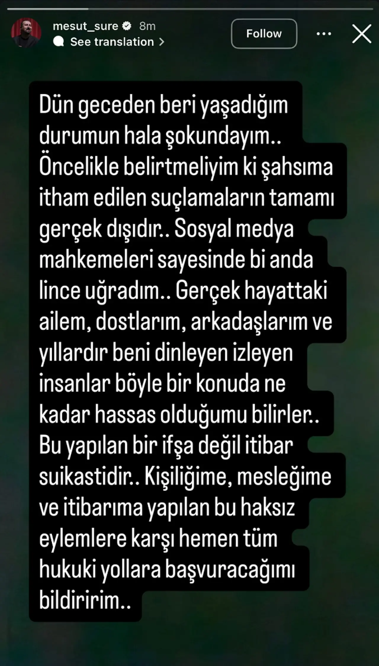 Açıklamasında, söz konusu paylaşımların bir ifşa değil, doğrudan “itibar suikastı” olduğunu savunan Süre, hukuki süreç başlatacağını da duyurdu: