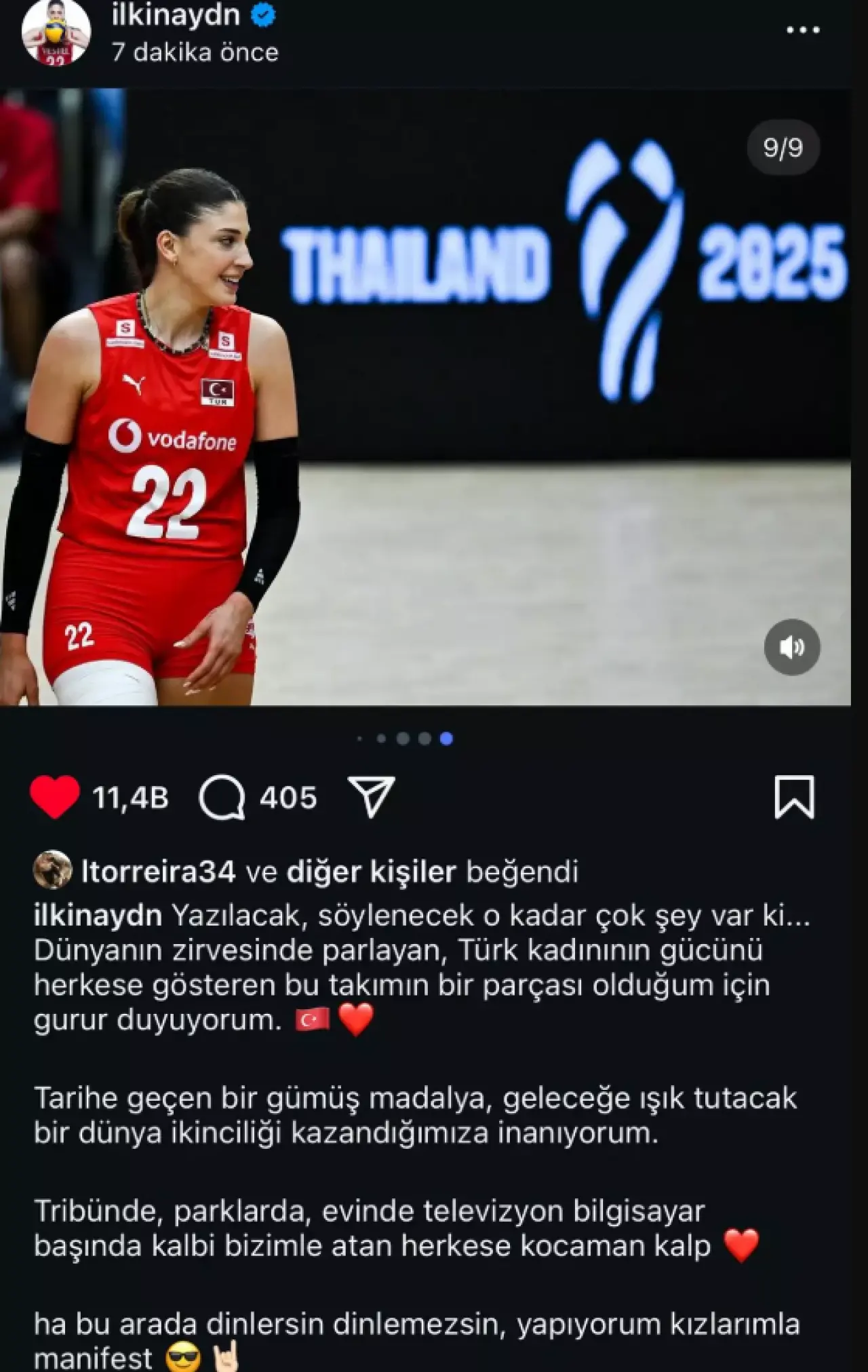 "Yazılacak, söylenecek o kadar çok şey var ki... Dünyanın zirvesinde parlayan, Türk kadınının gücünü herkese gösteren bu takımın bir parçası olduğum için gurur duyuyorum... Dinlersin dinlemezsin, yapıyorum kızlarımla manifest."