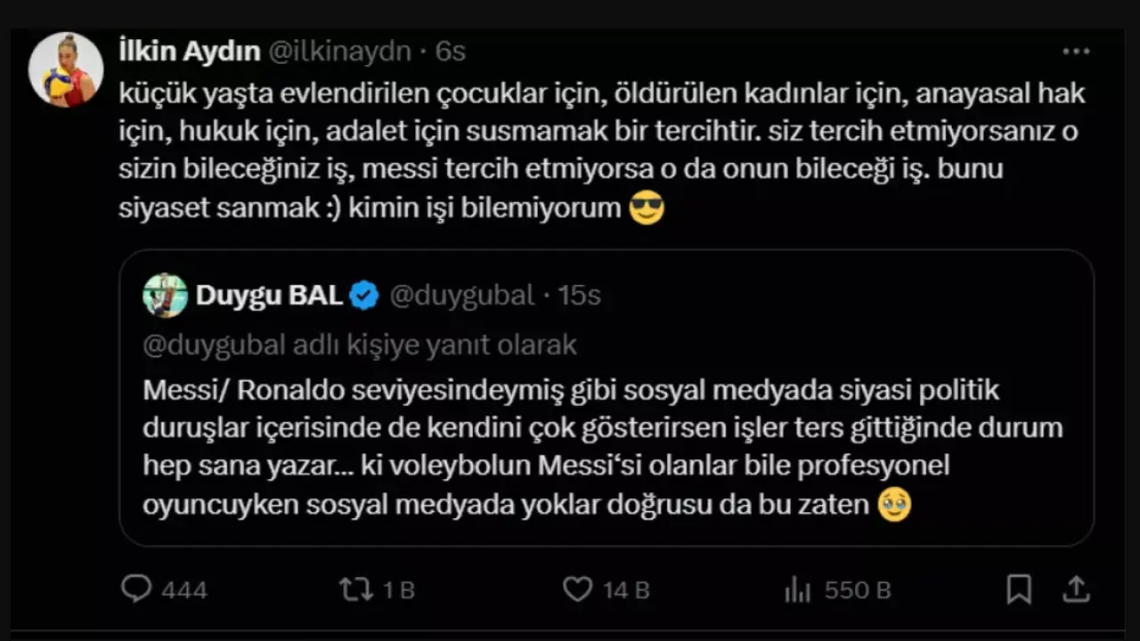 Duygu Bal, Aydın’ın paylaşımına sert tepki gösterdi. “Takım oyunu” vurgusu yapan Bal, profesyonel sporcuların politik duruş göstermemesi gerektiğini savundu: