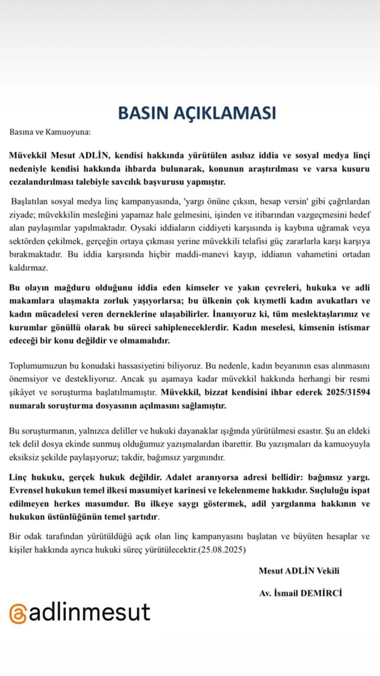 Avukat Demirci, “Müvekkil Mesut Adlin hakkında yürütülen asılsız iddia ve sosyal medya linci nedeniyle savcılığa başvuruda bulunmuş, 2025/31594 numaralı dosya açılmıştır. Müvekkil, kendisi hakkında araştırma yapılmasını ve varsa kusurunun cezalandırılmasını talep etmektedir” dedi.