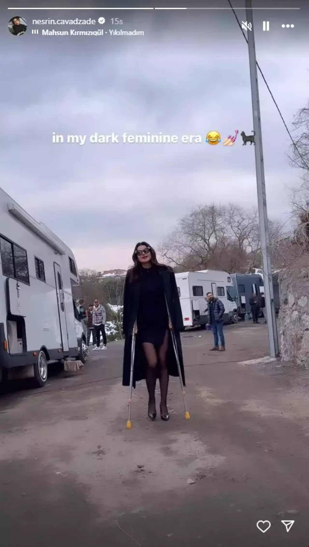 Ünlü oyuncu, sosyal medya hesabından sette olduğunu Mahsun Kırmızıgül’ün “Yıkılmadım” şarkısıyla duyurdu. Bu paylaşımı kısa sürede büyük ilgi gördü. Hayranları, başarılı oyuncuya geçmiş olsun dileklerinde bulundu.