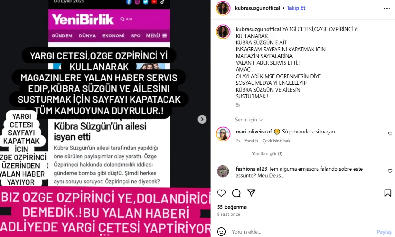 Süzgün’ün ailesi tarafından yönetildiği öne sürülen sosyal medya hesabından yapılan paylaşımlarda Özpirinçci’ye ağır ifadeler yöneltildi. İddialara göre aile, oyuncuyu “adliyelerde borsa yaparak 6 yıldır bizden kaçmakla” suçladı. Paylaşımlarda Özpirinçci’nin avukatı Nail Gönenli’nin de ismi geçti.