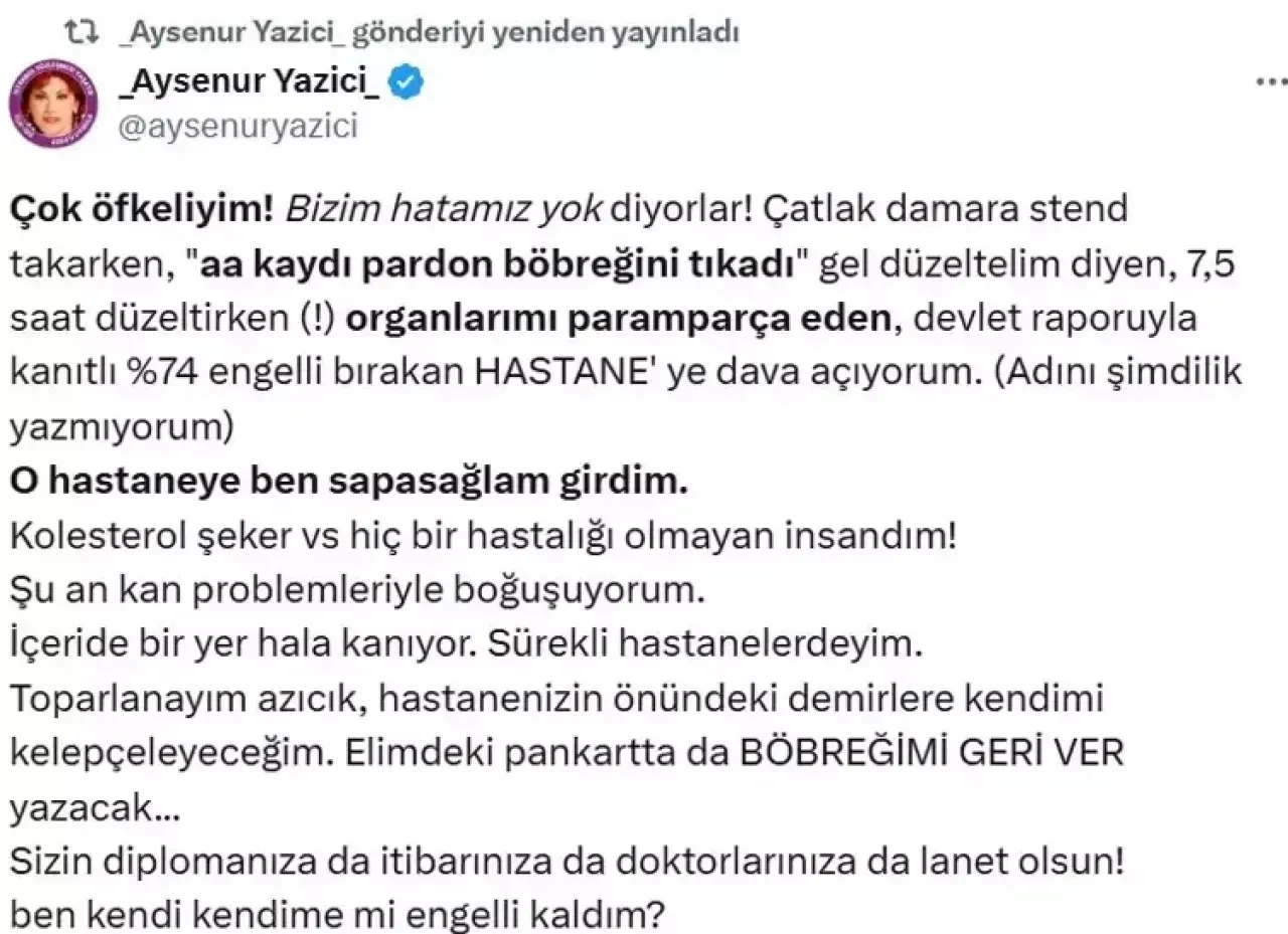 Sosyal medyadan yaptığı açıklamada Yazıcı, "7,5 saat süren düzeltme girişimi sırasında organlarım hasar gördü, bir böbreğim tıkandı" diyerek hastaneye isyan etti.
