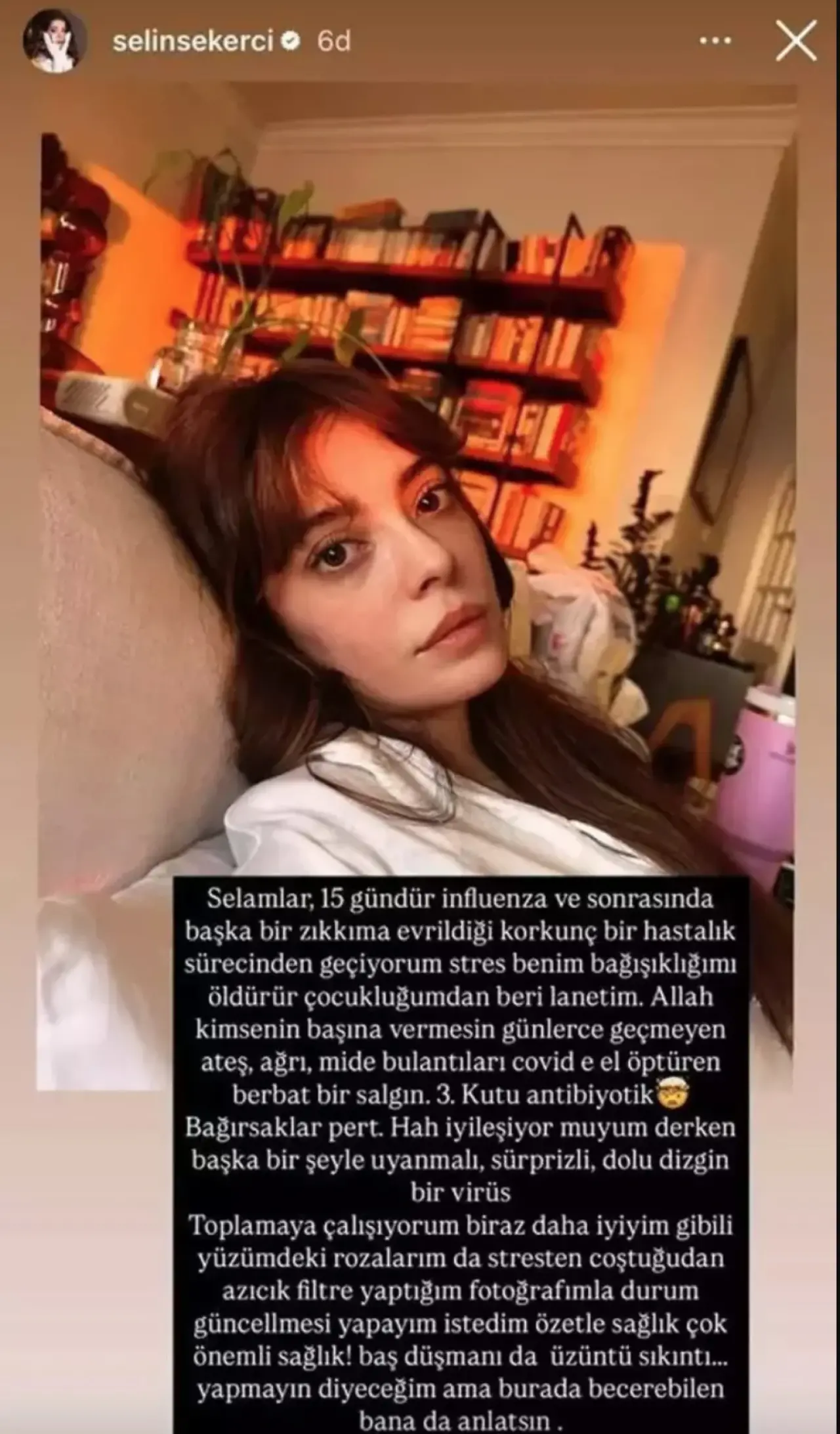 Kendini toparlamaya çalıştığını dile getiren Selin Şekerci, tam iyileşiyorum derken başka bir sorunla karşılaştığını ifade etti. "Bağırsaklar pert, ateş, ağrı, mide bulantısı... COVID’e el öptüren bir virüsle savaşıyorum" diyen ünlü oyuncu, yaşadığı enfeksiyonun etkilerinin oldukça ağır olduğunu belirtti.