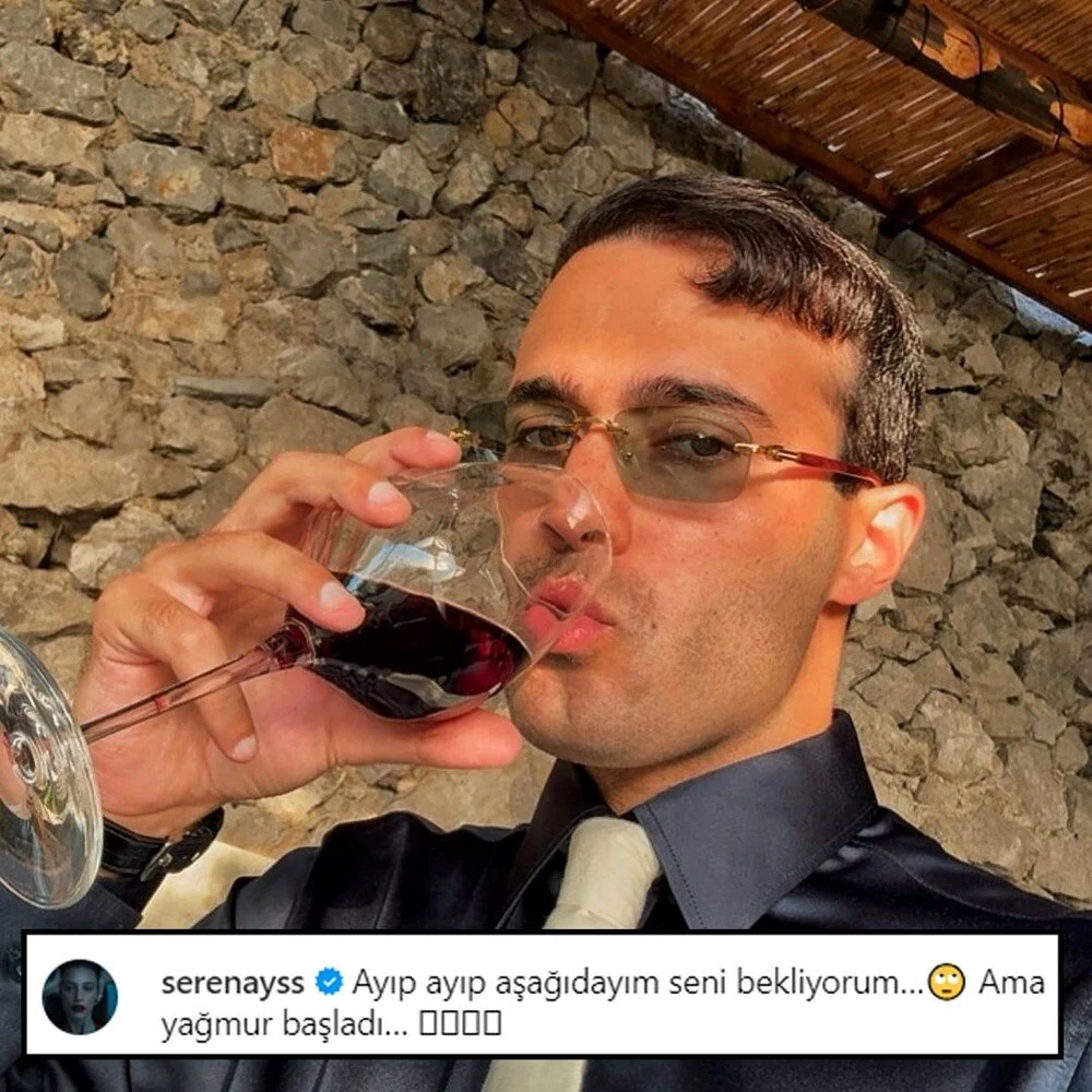 Sarıkaya ise sevgilisinin pozuna kayıtsız kalamadı ve "Ayıp ayıp aşağıdayım, seni bekliyorum. Yağmur başladı…" yorumunu yaptı.