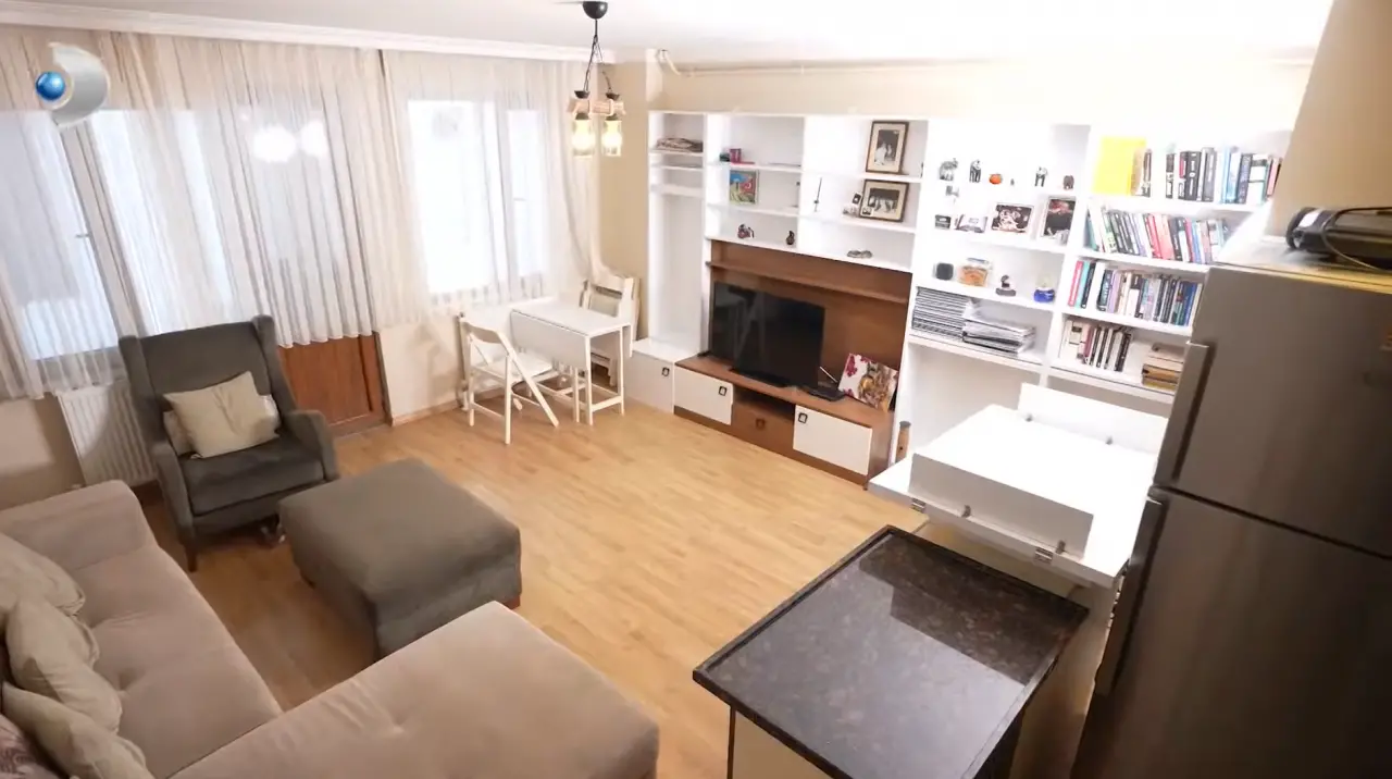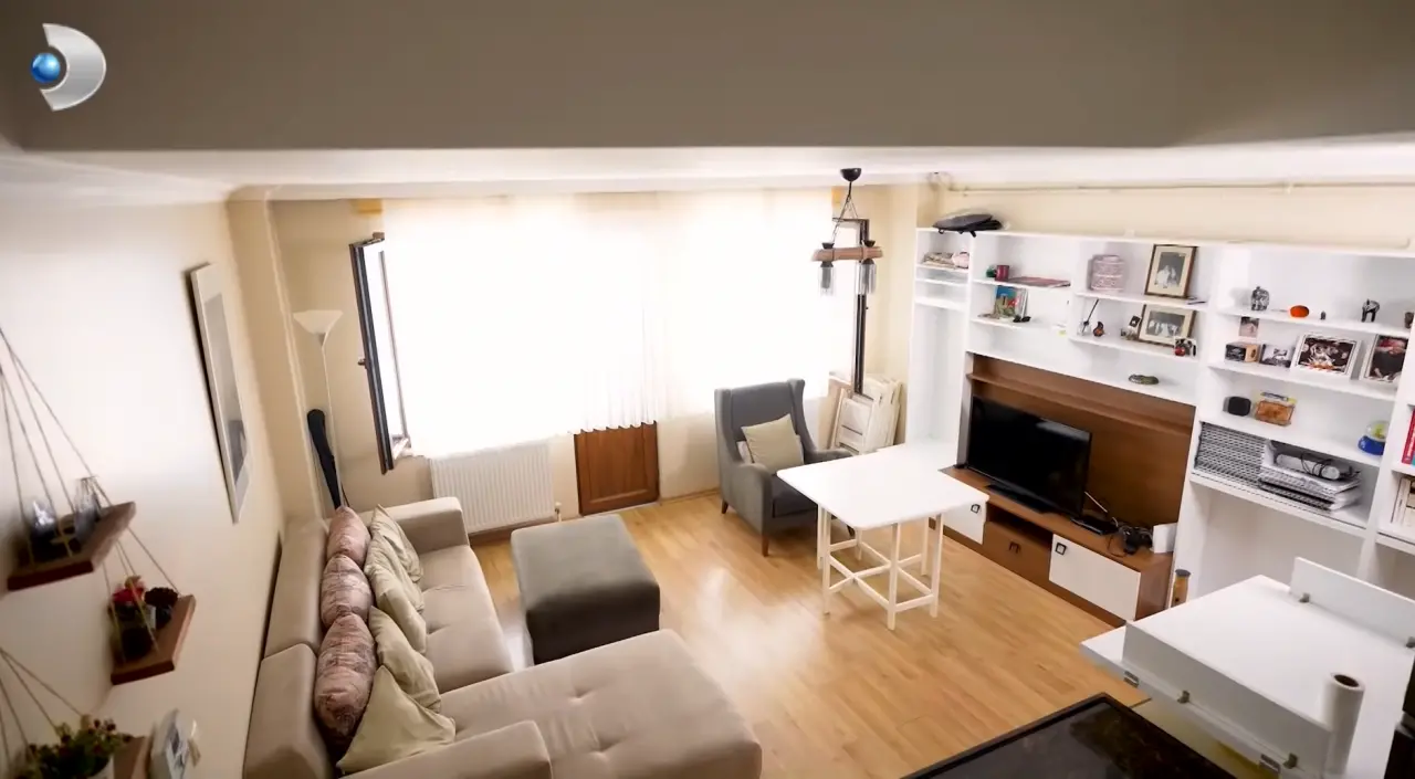 İki oda bir salon olan daire, sade ama huzurlu dekorasyonuyla dikkat çekiyor. Salona girer girmez toprak tonlarındaki büyük köşe koltuk karşılıyor. Karşısında ise beyaz büyük bir ünite, kitaplar, anılarla dolu fotoğraflar ve objeler yer alıyor.