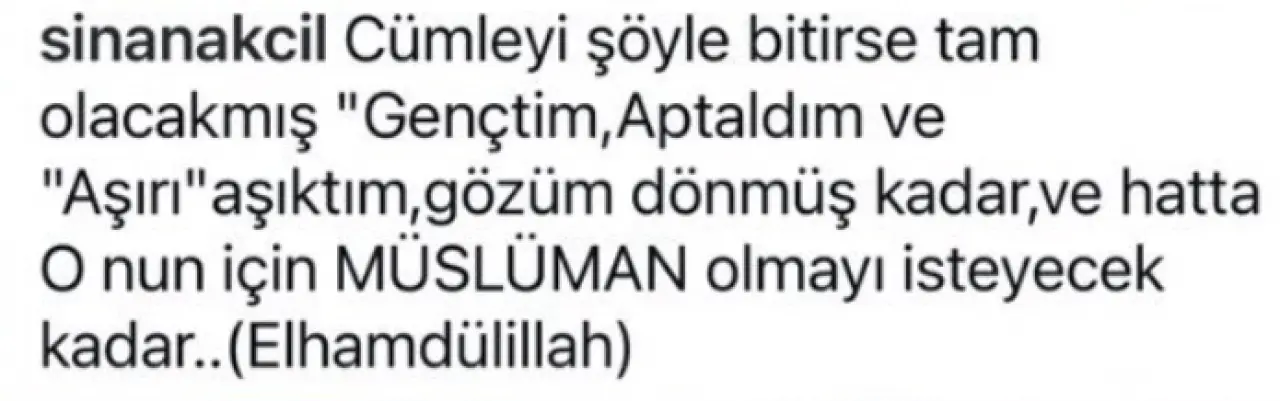 Ünlü şarkıcı Sinan Akçıl, eski sevgilisi Rumen şarkıcı Otilia’nın ilişkileri için kullandığı “Genç ve aptaldım” sözlerine kayıtsız kalmadı. Akçıl, sosyal medya hesabından yaptığı paylaşımda, “Cümleyi şöyle bitirmeliydi: Genç, aptal ve aşırı aşıktım. Hatta onun için Müslüman olmayı isteyecek kadar” diyerek dikkat çeken bir çıkış yaptı.