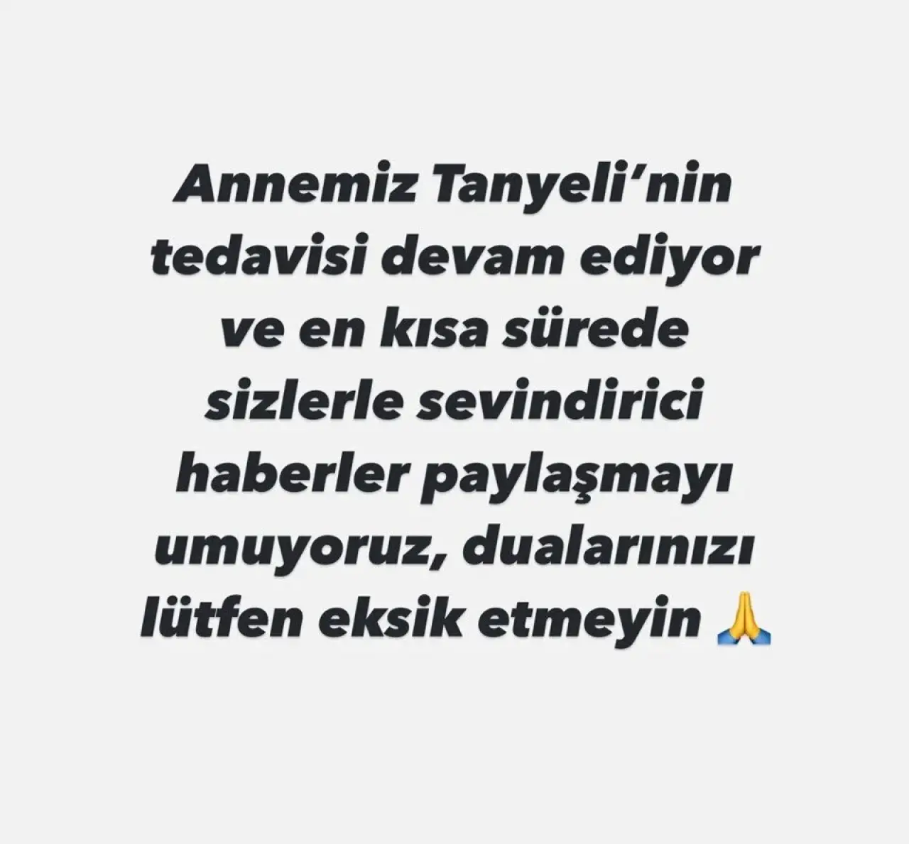 "Annemiz Tanyeli’nin tedavi süreci devam ediyor. En kısa zamanda güzel haberler vermeyi umuyoruz. Dualarınızı lütfen eksik etmeyin."