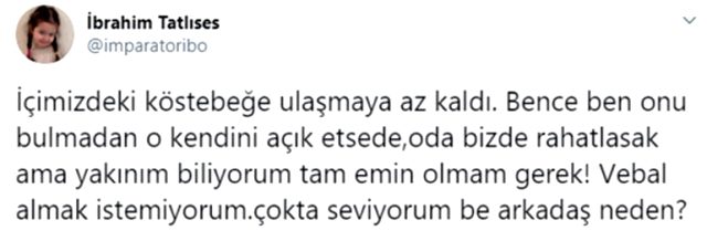 Sosyal medya hesabından bir paylaşım yapan Tatlıses, "İçimizdeki köstebeğe ulaşmaya az kaldı. Bence ben onu bulmadan o kendini açık etse de, o da biz de rahatlasak ama yakınım biliyorum, tam emin olmam gerek. Vebal almak istemiyorum. Çok da seviyorum be arkadaş neden?" ifadelerini kullandı.