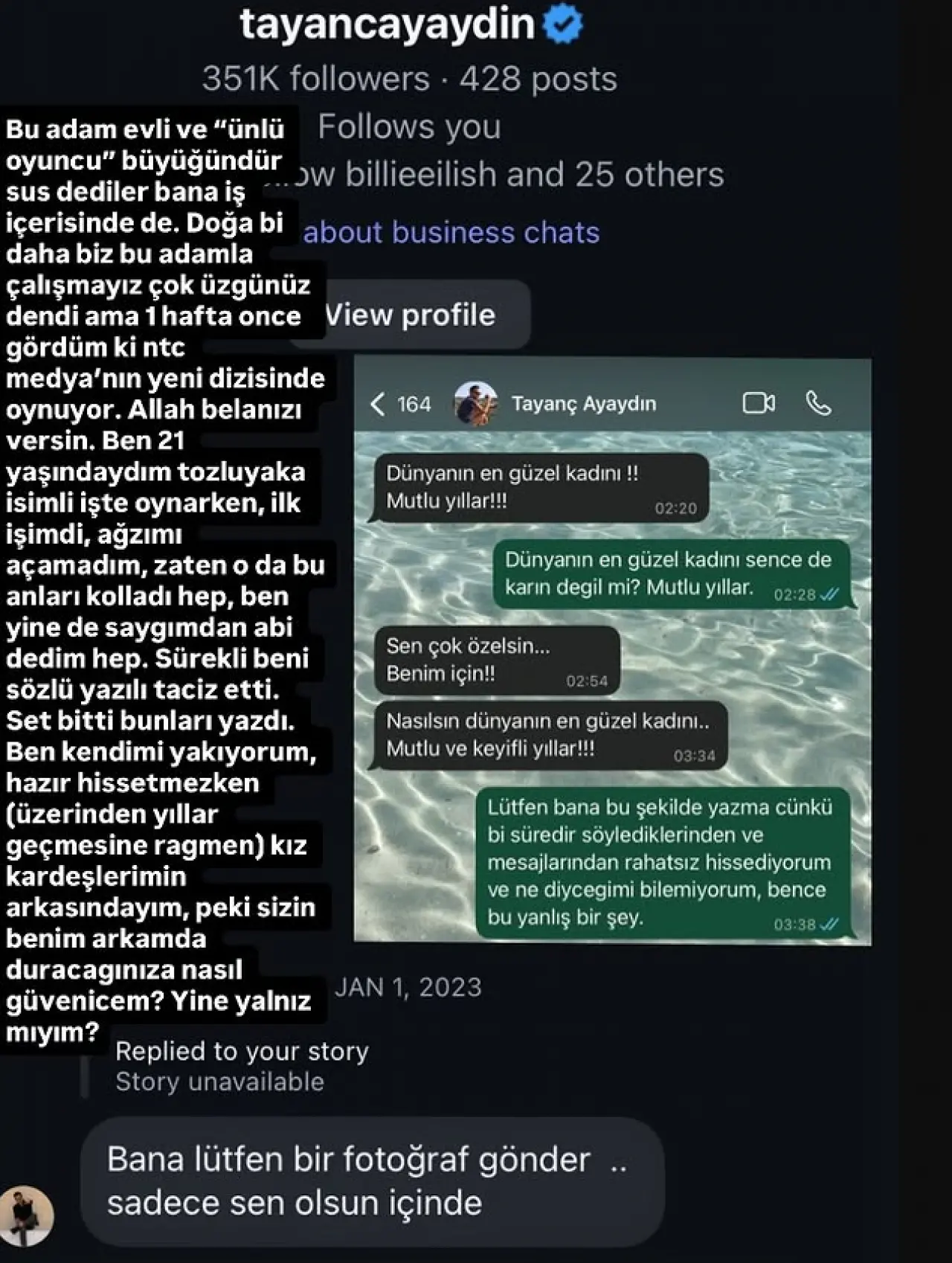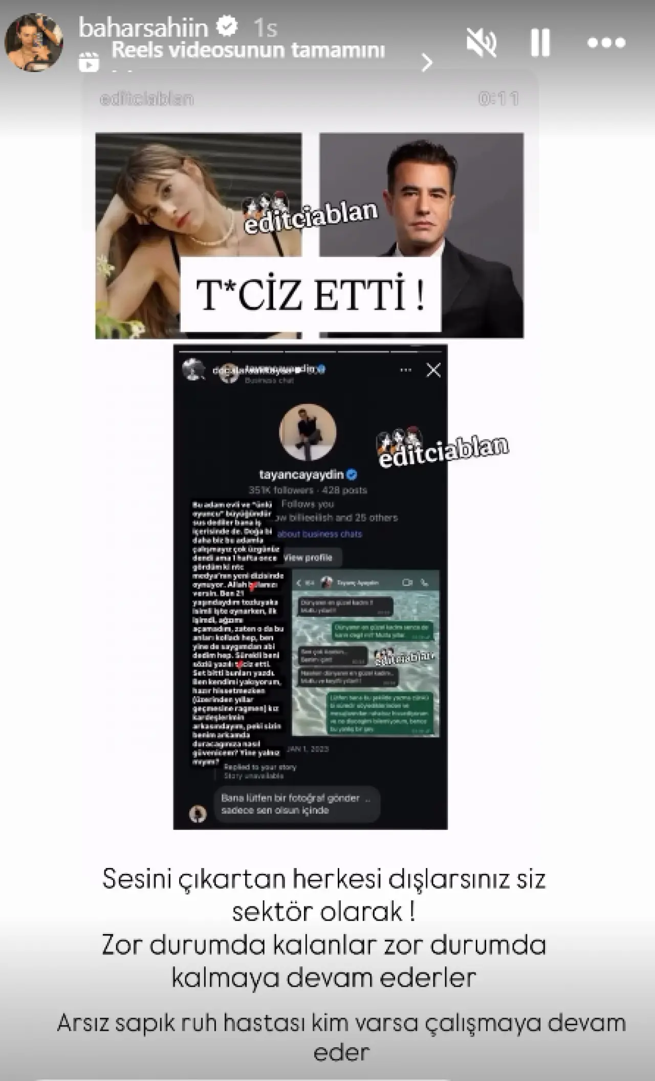 Akkaya, sosyal medya hesabından yaptığı paylaşımda Ayaydın’ın kendisini set boyunca sözlü ve yazılı olarak taciz ettiğini iddia etti.