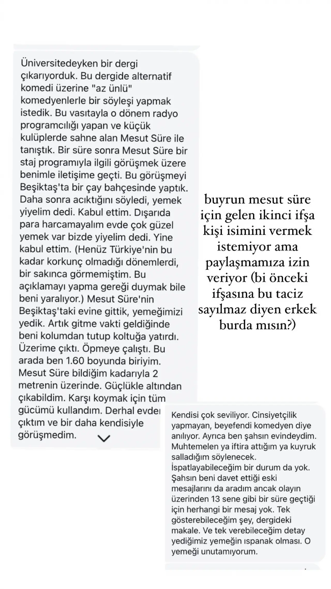 Olay, bir kadının sosyal medya hesabından yaptığı paylaşım ile patlak verdi. İddiaya göre, yıllar önce bir dergi projesi için tanıştığı Mesut Süre, yemek bahanesiyle genç kadını Beşiktaş'taki evine davet etti. Genç kadın, "Henüz Türkiye'nin bu kadar korkunç olmadığı dönemlerdi" diyerek başladığı hikayesinde, yemeğin ardından yaşananları kan donduran detaylarla anlattı. Paylaşım, sosyal medyada hızla yayılarak Mesut Süre ismini bir anda zirveye taşıdı.