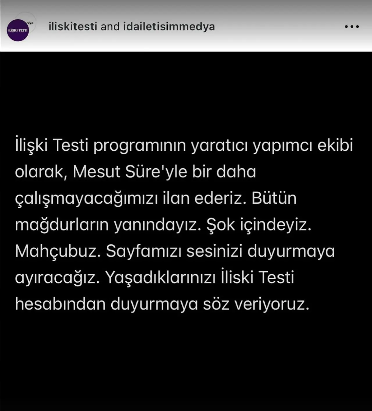Hakkındaki taciz iddialarının sosyal medyada hızla yayılmasının ardından, beklenen açıklama geldi. Mesut Süre'nin sunuculuğunu yaptığı popüler program İlişki Testi'nin yapımcı firması olan İda İletişim, skandal bir duyuruyla yollarını Mesut Süre'den ayırdıklarını ilan etti.