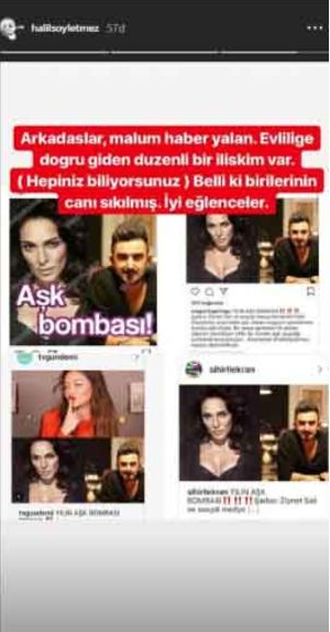 Sosyal medya fenomeni Söyletmez ise instagram hesabından açıklama yaparak, evliliğe giden bir ilişkisi olduğunu belirtirken, iddialar şu şekilde yanıt verdi "Arkadaşlar, malum haber yalan. Evliliğe doğru giden düzenli bir ilişkim var. (Hepiniz biliyorsunuz) Belli ki birilerinin canı sıkılmış. İyi eğlenceler." İşte Halil Söyletmez'in paylaşımı