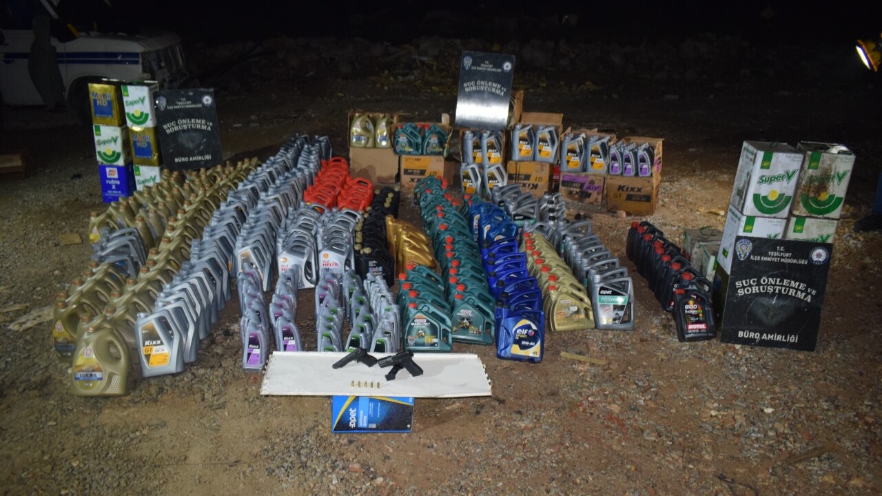 Şüphelilere ait iş yerinin bahçesinde yapılan aramalarda su tankı içerisine gizlenmiş, 325 motor yağı ile ruhsatsız tabanca ve kurusıkı tabanca ele geçirildi.