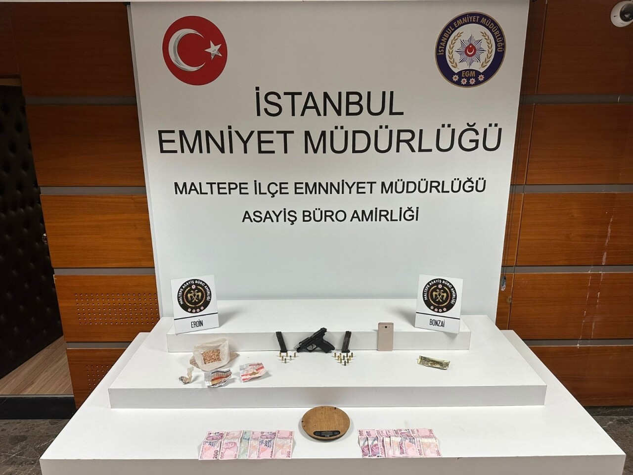 Adresteki aramada, 304,99 gram eroin, bir miktar bonzai, hassas terazi, 1 ruhsatsız tabanca, 2 şarjör ile 16 fişek ve 2 bin 995 lira para ele geçirildi.
