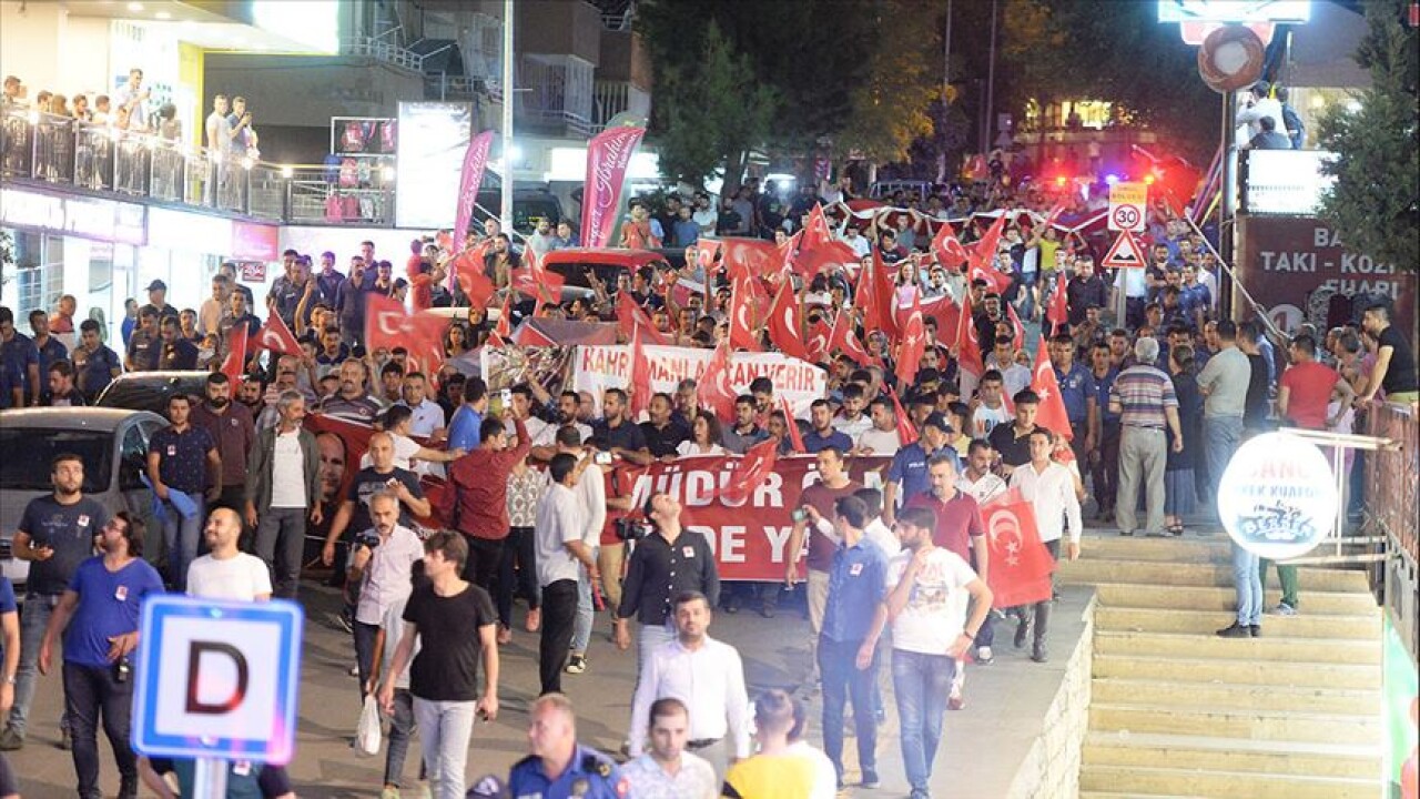 Mardin'in merkez Artuklu ilçesinde 15 Temmuz Demokrasi ve Şehitler Parkı'nda toplanan vatandaşlar, Mardin Özel Harekat Şube Müdürü Tufan Kansuva, Jandarma Uzman Onbaşı Mehmet Acar ile güvenlik korucusu Evren Başçı'nın şehit edilmesi dolayısıyla terörü lanetledi, "Diyarbakır anneleri"ne destek verdi.