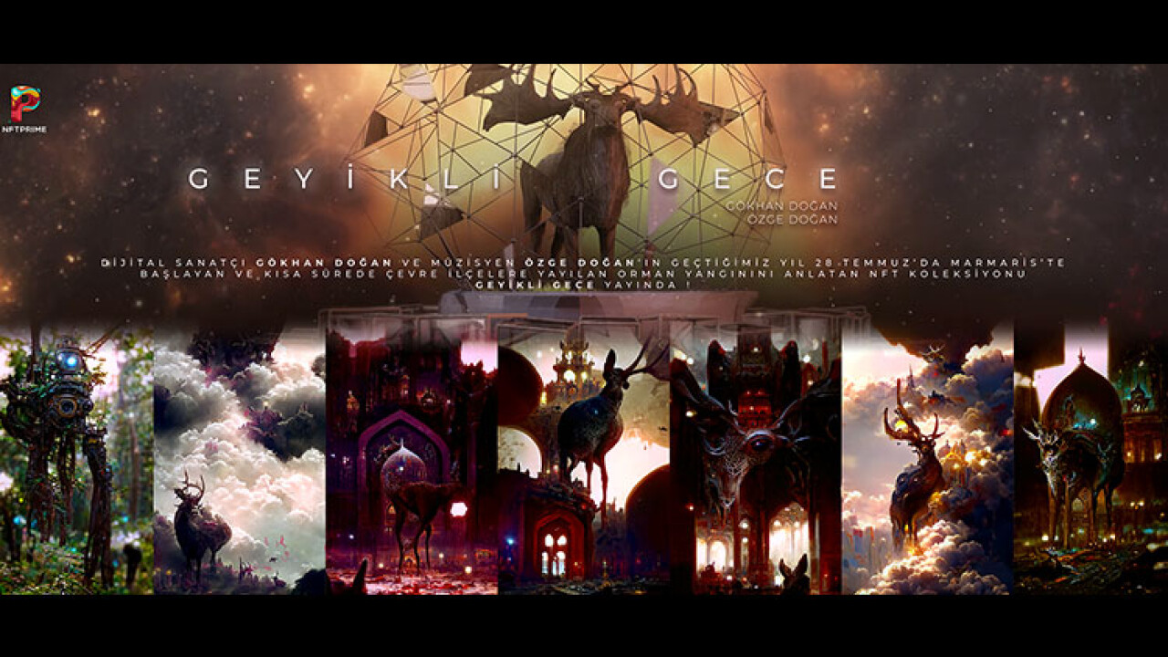 Dijital Sanatçı Gökhan Doğan ve Müzisyen Özge Doğan'ın geçtiğimiz yıl 28 Temmuz'da Marmaris'te başlayan ve kısa sürede çevre ilçelere yayılan orman yangınını anlatan NFT koleksiyonu Geyikli Gece, Türkiye'nin öncü NFT platformu NFTPrime üzerinden satışa sunuldu.