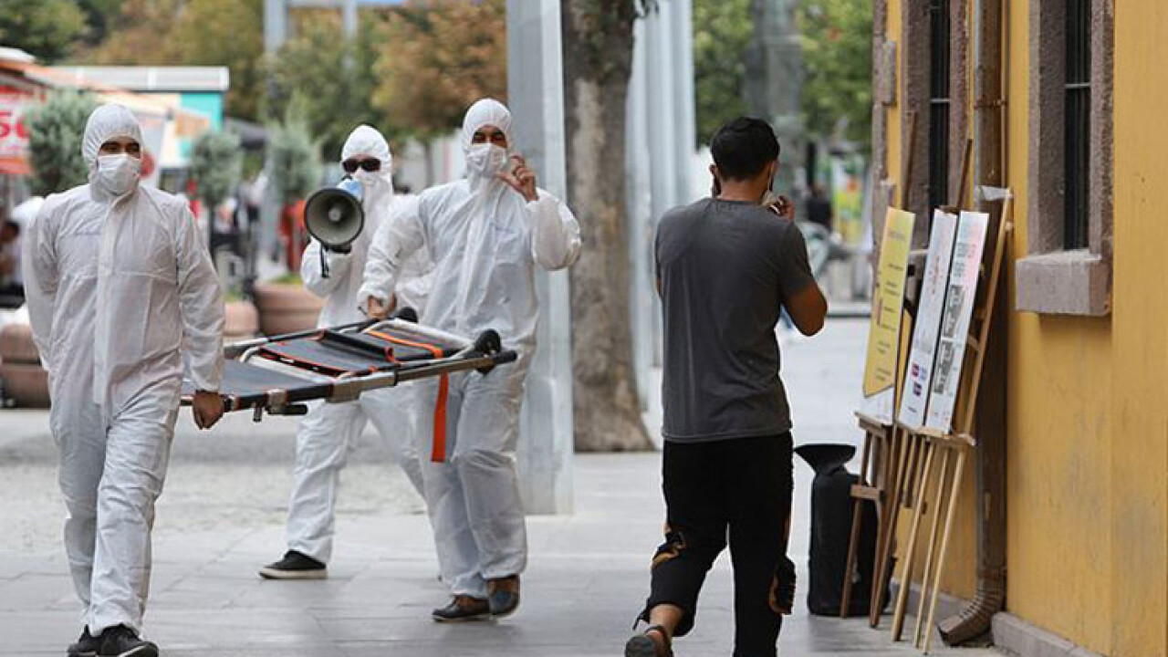 Kentin en işlek caddelerinden Zafer Meydanı'nda, tulum giyen ve maske takan dernek üyeleri, maskesiz gezen veya maskesini doğru şekilde takmayan vatandaşın önüne sedye ile çıktı.