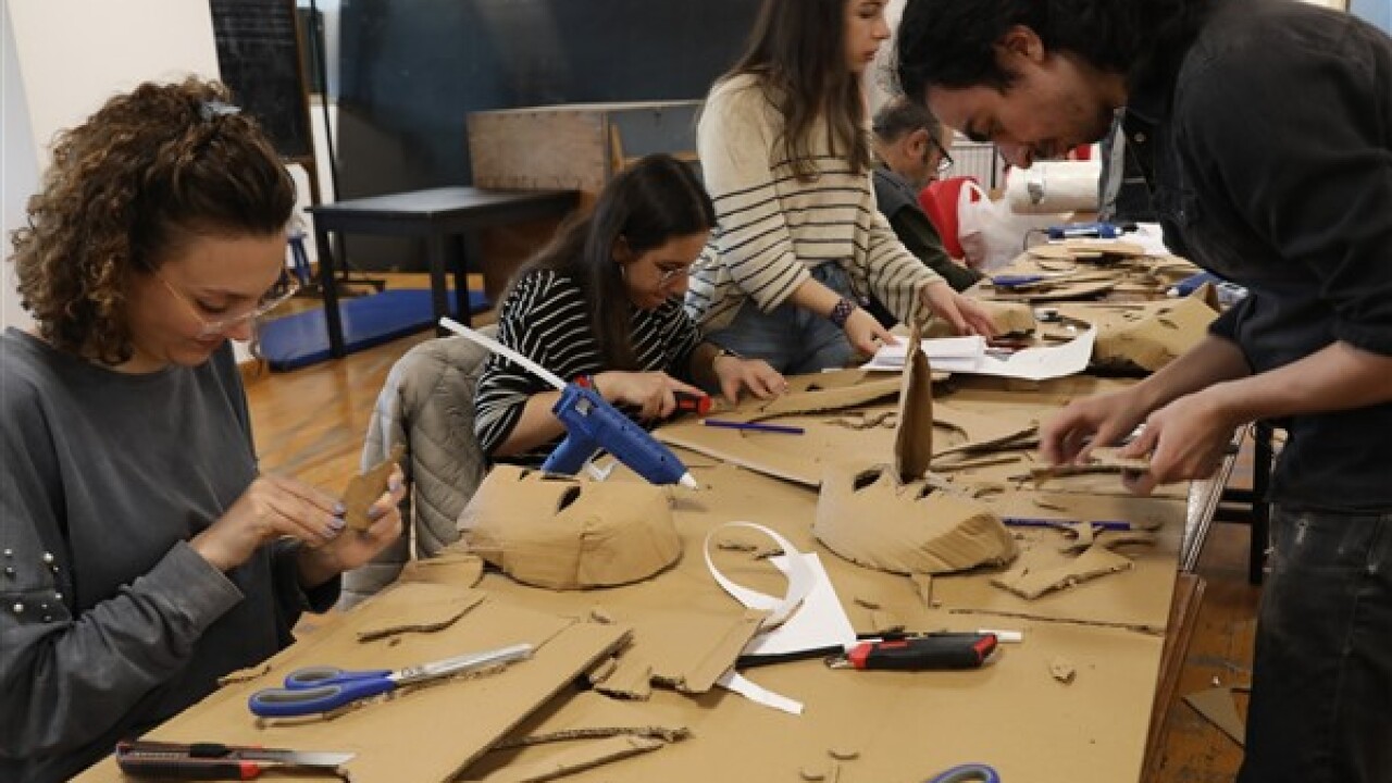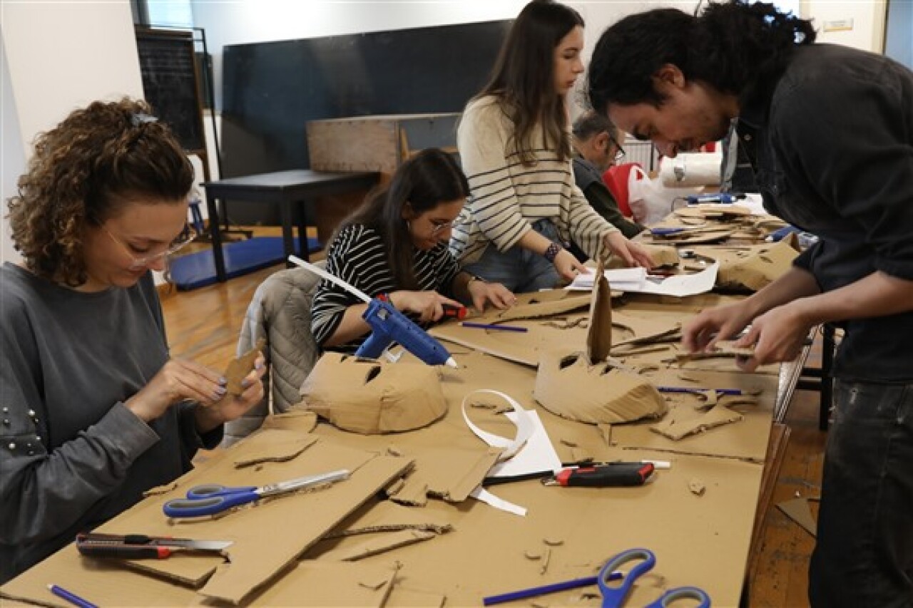 Candan Seda Balaban 3 günlük atölye sürecinde gençlere kartonlardan maske ve kukla yapımını öğretti.