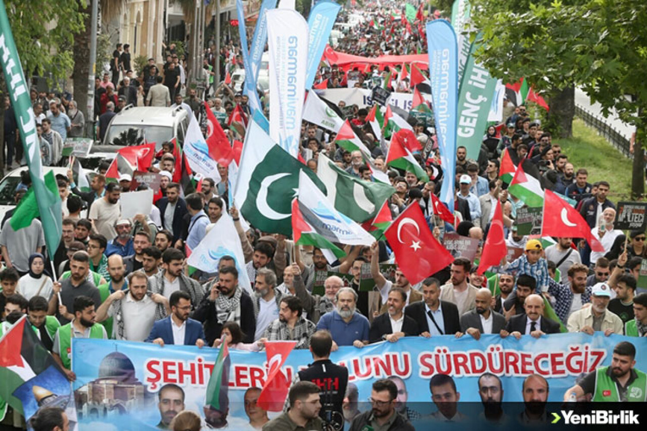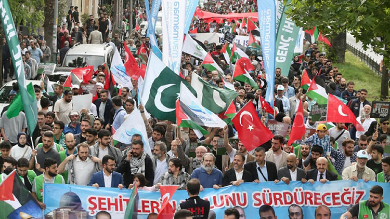 "Mavi Marmara onurumuzdur" sloganı atarak yürüyen grubun çevresinde polis ekipleri yoğun güvenlik önlemi aldı.