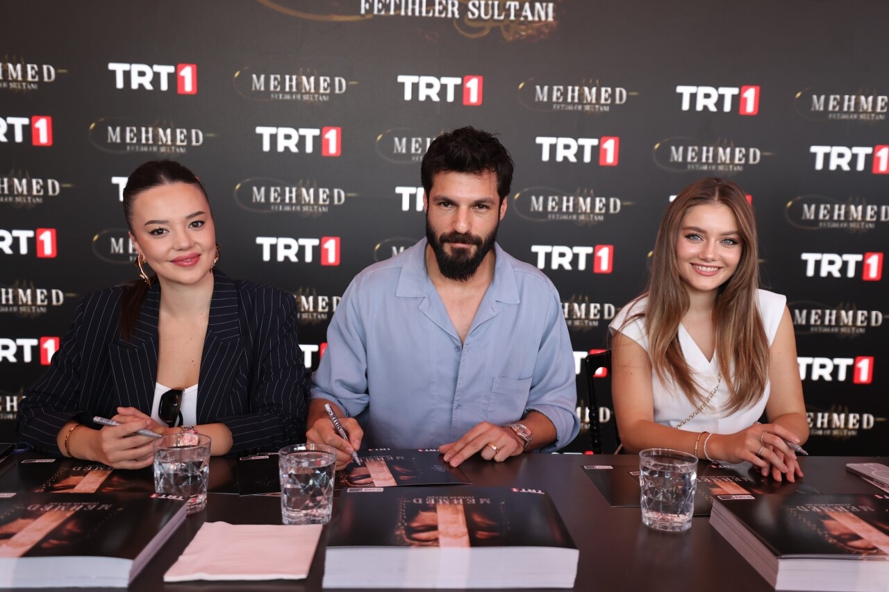Festivali gezen "Mehmed: Fetihler Sultanı" dizisinin oyuncuları Serkan Çayoğlu, Sena Çakır ve Esila Umut, TRT standında düzenlenen etkinliğe katıldı.