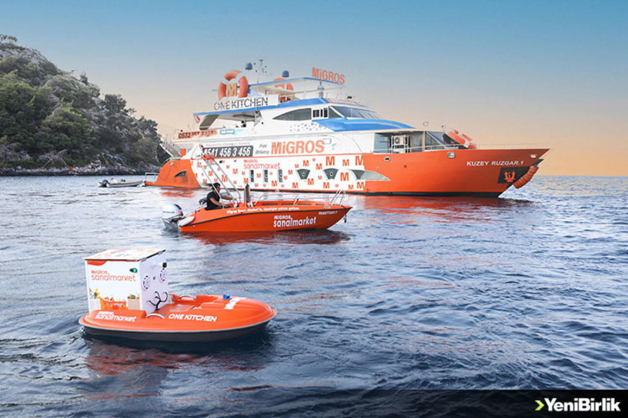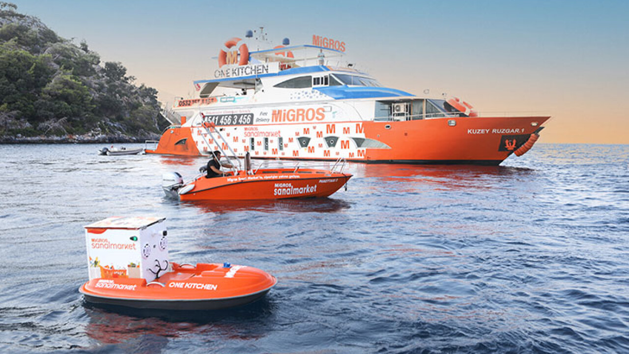 Migros'tan yapılan açıklamaya göre, yine dünyada bir ilk olarak market ve hazır yemek siparişlerini teknede seyahat eden müşterilerine insansız teslimat araçları ile ulaştırmaya başladı.