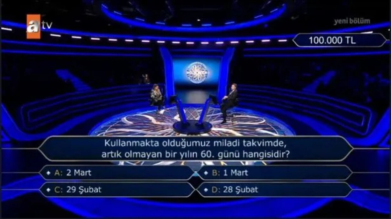 Kim Milyoner Olmak İster yarışmasında sorulan "Miladi takvimde artık olmayan bir yılın 60. günü hangisidir?" sorusu büyük ilgi uyandırdı. İşte doğru cevap ve detaylar!