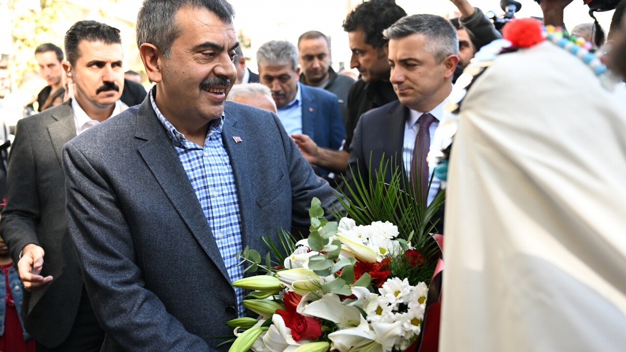 Tarihi Kayseri Lisesi'ne gelen Tekin'e öğrenciler tarafından çiçek takdim edildi.