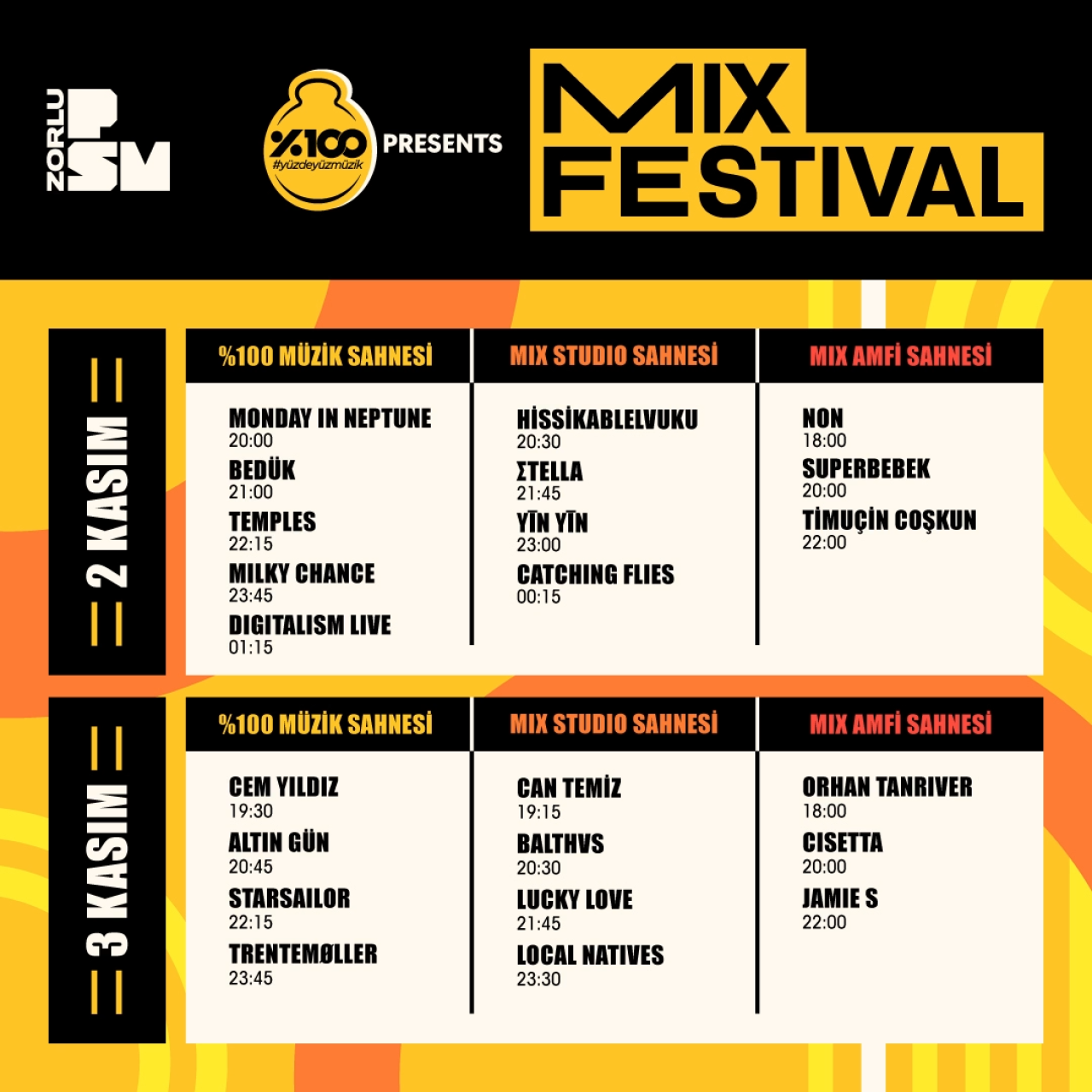 MIX Festival presented by %100 Müzik iki gün boyunca %100 Müzik sahnesi, MIX Amfi Sahnesi ve MIX Studio sahnelerinde çok sesli, çok eğlenceli!