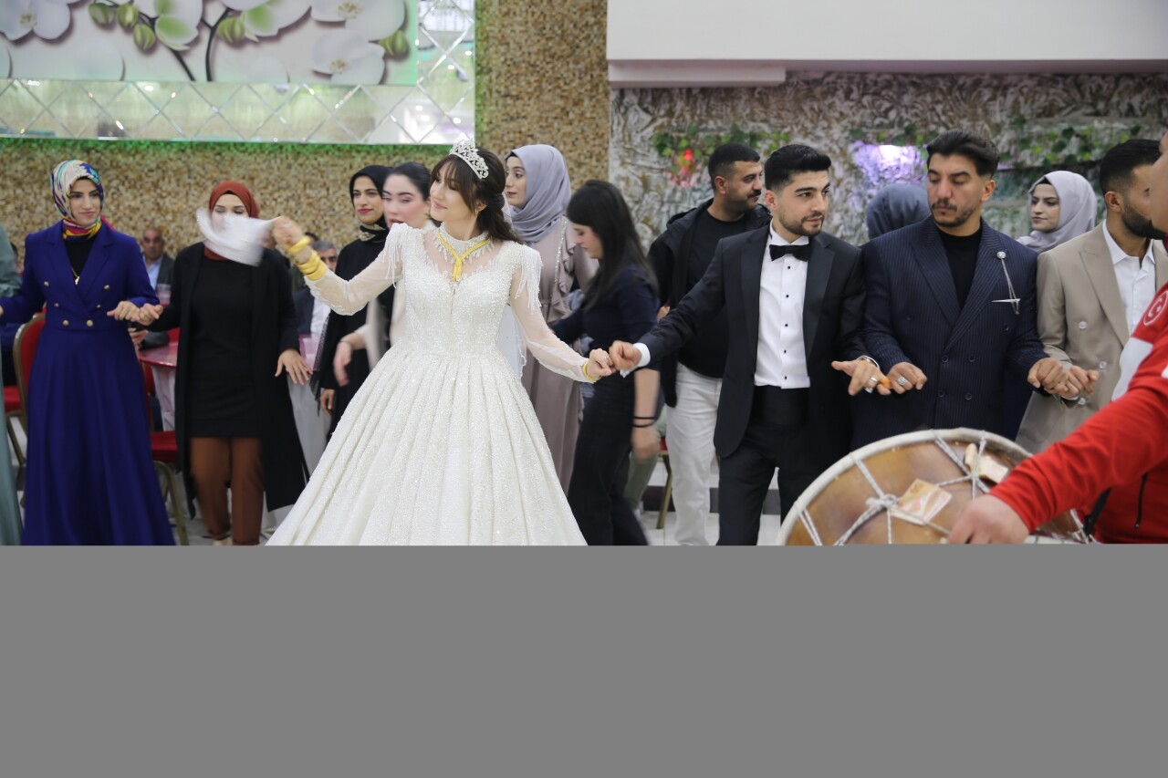 Düğünde dans eden çift, alkışlar eşliğinde pasta kesti, davetlilerle fotoğraf çektirdi.