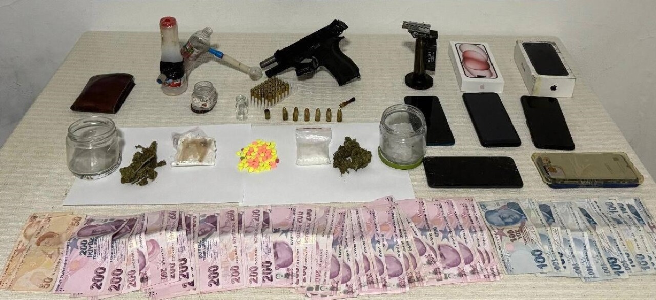 Çalışma kapsamında belirlenen adreslerde yapılan aramalarda bir miktar uyuşturucu, ruhsatsız tabanca, 39 fişek, 2 esrar öğütme aparatı, suçtan kazanıldığı değerlendirilen 11 bin 350 lira ele geçirildi.