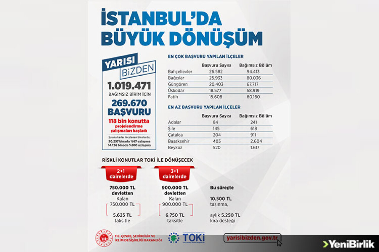 Çevre, Şehircilik ve İklim Değişikliği Bakanlığı, Cumhurbaşkanı Recep Tayyip Erdoğan’ın müjdesini vererek Türkiye’nin en büyük kentsel dönüşüm projesi olarak tanımladığı “Yarısı Bizden” kampanyasının başvuru sürecinin sonlandığını duyurdu. 26 Nisan’da e-Devlet üzerinden başlayan başvuru süreci 31 Mayıs’ta sonlandı. Başvuruları sonlanan Yarısı Bizden kampanyasıyla ilgili resmî sosyal medya hesabından açıklamada bulunan Çevre, Şehircilik ve İklim Değişikliği Bakanı Murat Kurum, “Yarısı Bizden kampanyamızda başvurular sona erdi. 1 milyon 19 bin 471 bağımsız birim, 269 bin 670 başvuru yapıldı. Şu ana kadar uzlaşı sağlanan 108 bin konutta projelendirme çalışmaları başlatıldı. Tüm başvurular incelenecek, çoğunluğun sağlandığı binalarda dönüşüm süreci hemen başlayacak. İstanbul'umuzu tüm afetlere karşı daha dirençli kılmak için durmadan çalışacağız!” dedi.