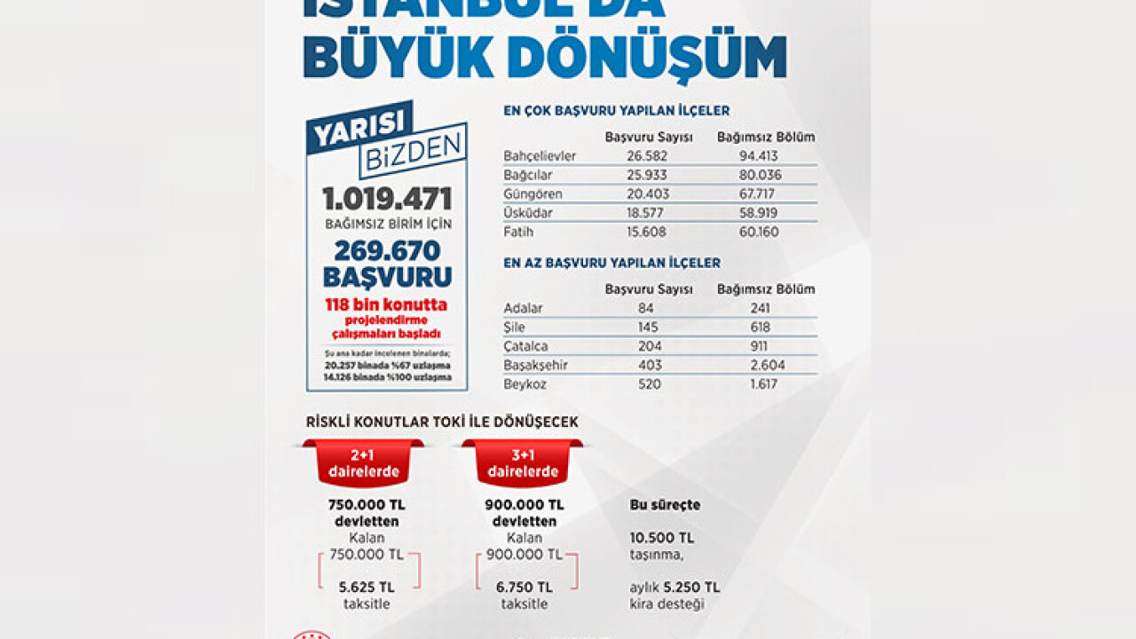 “Yarısı Bizden” kampanyasına İstanbul genelinde 90 bin 61 binada 1 milyon 19 bin 471 bağımsız bölümde 269 bin 66 başvuru yapıldı. İstanbul’un ilçelerinde ise başvuru rakamları şu şekilde oldu: