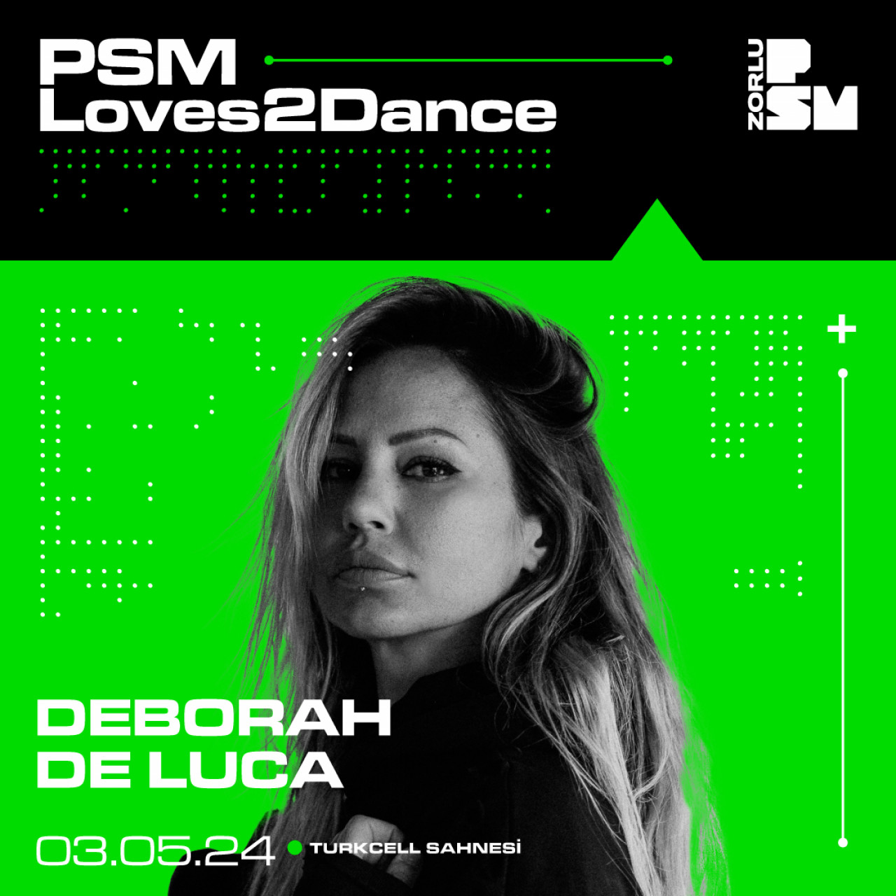 Napoli'de müzik hayatına başlayan, sert teknoyu minimal ritimler ve melodik ses manzaralarıyla harmanlayarak sürükleyici bir etkiyle küresel çapta tanınan Deborah De Luca İstanbullu müzikseverler ile Zorlu PSM’de buluşuyor. Son 10 yılda uluslararası tekno sahnesinde kararlılığı ve tutkusuyla sevilen DJ, yapımcı ve plak şirketi sahibi Deborah de Luca, “PSMLoves2Dance” konser serisi kapsamında 3 Mayıs Cuma akşamı Turkcell Sahnesi’nde binlerce müziksever ile buluşacak.