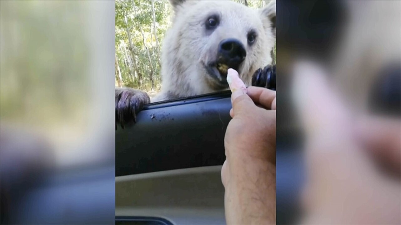 Bitlis'in Tatvan ilçesindeki Nemrut Kalderası'na giden Asım Araboğa'nın, aracına yaklaşan bozayıya şeker yedirdiği anlar kameraya yansıdı.