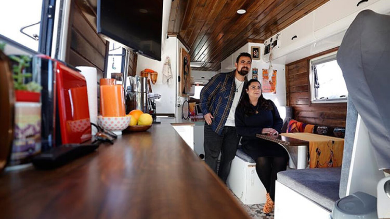 Nişanlı oldukları dönemde satın aldıkları otobüsü, içini yaptırarak "Pera" adını verdikleri karavana dönüştüren genç çift, 6 aydır "küçük yuvalarında" hayatı paylaşıyor.