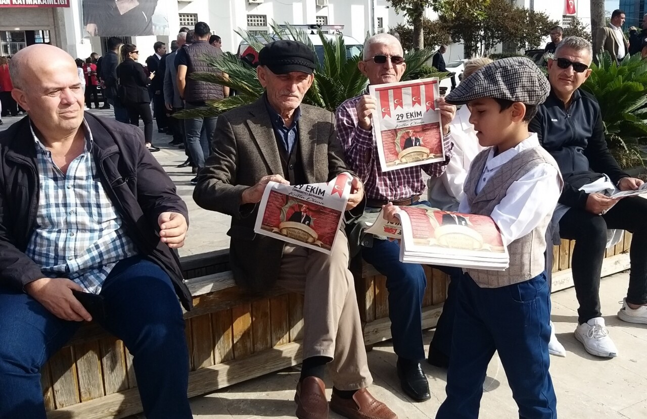 Kasket takan ve yelek giyen öğrenciler, Cumhuriyet'in ilanının 101. yıl dönümünü etkinlikleri kapsamında, öğretmenleri eşliğinde hazırladıkları gazeteyi Cumhuriyet Meydanı’nda "yazıyor yazıyor" şeklinde seslenerek dağıttı.