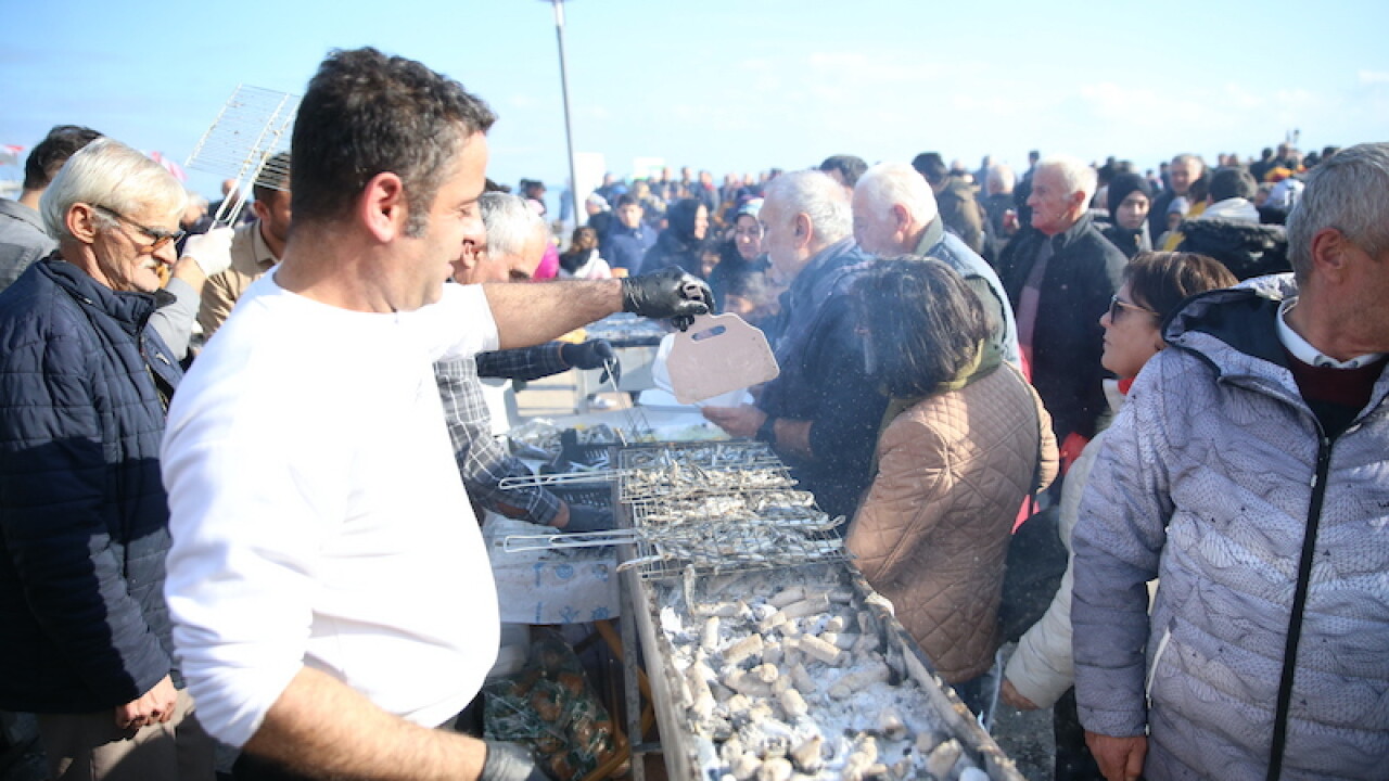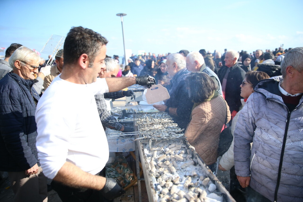 İlçe sahilindeki alanda kurulan ızgaralarda pişirilen 10 ton hamsi, katılımcılara dağıtıldı.