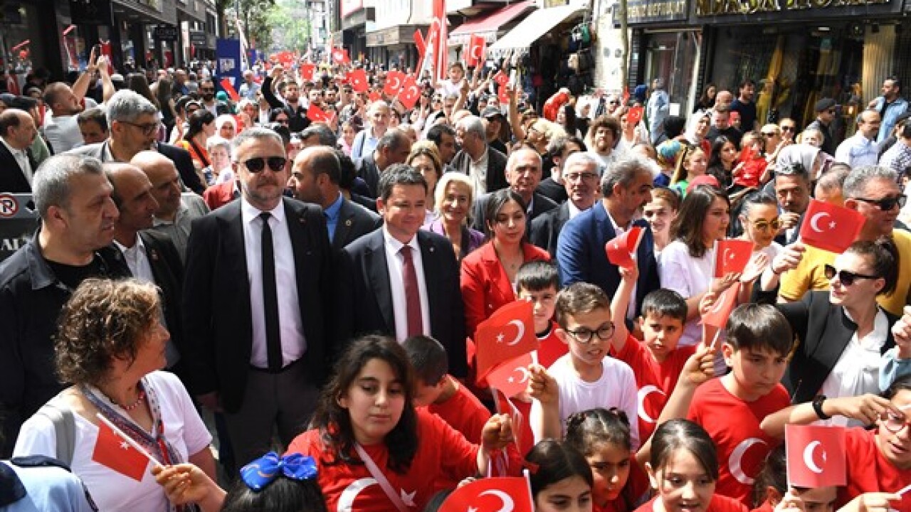 Sadi Etkeser İlkokulu öğrencilerinin bando ve halk oyunları gösterisinin ardından marşlar eşliğinde kortej yürüyüşüne geçildi. Başkan Erkan Aydın, çocuklar ve aileleriyle birlikte Zafer Plaza Meydanı’ndan Cumhuriyet Caddesi boyunca çocuk bandosu eşliğinde marşlar söyleyip, ay yıldızlı bayrakları sallayarak coşkulu bir yürüyüş gerçekleştirdi. Esnaf ve vatandaşların da büyük ilgi gösterdiği kortej yürüyüşü Abdal Meydanı’nda son buldu.